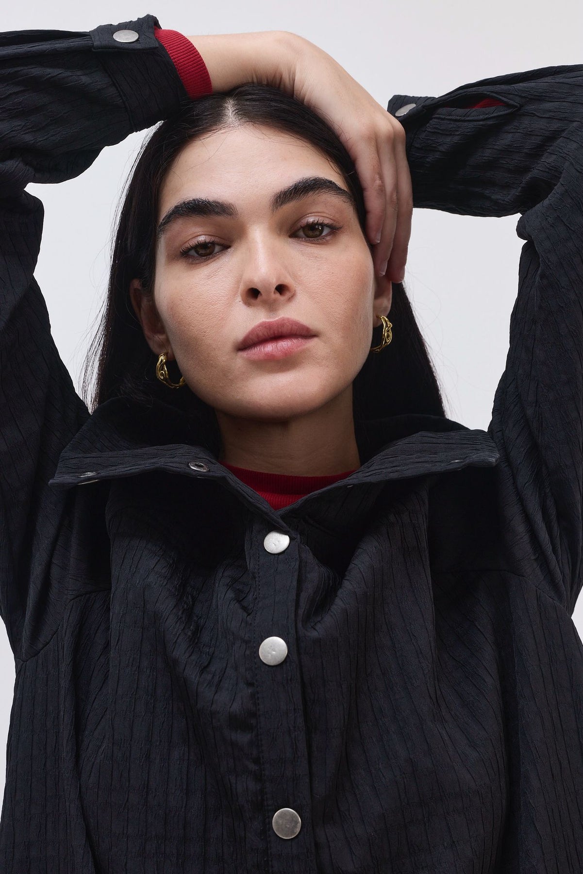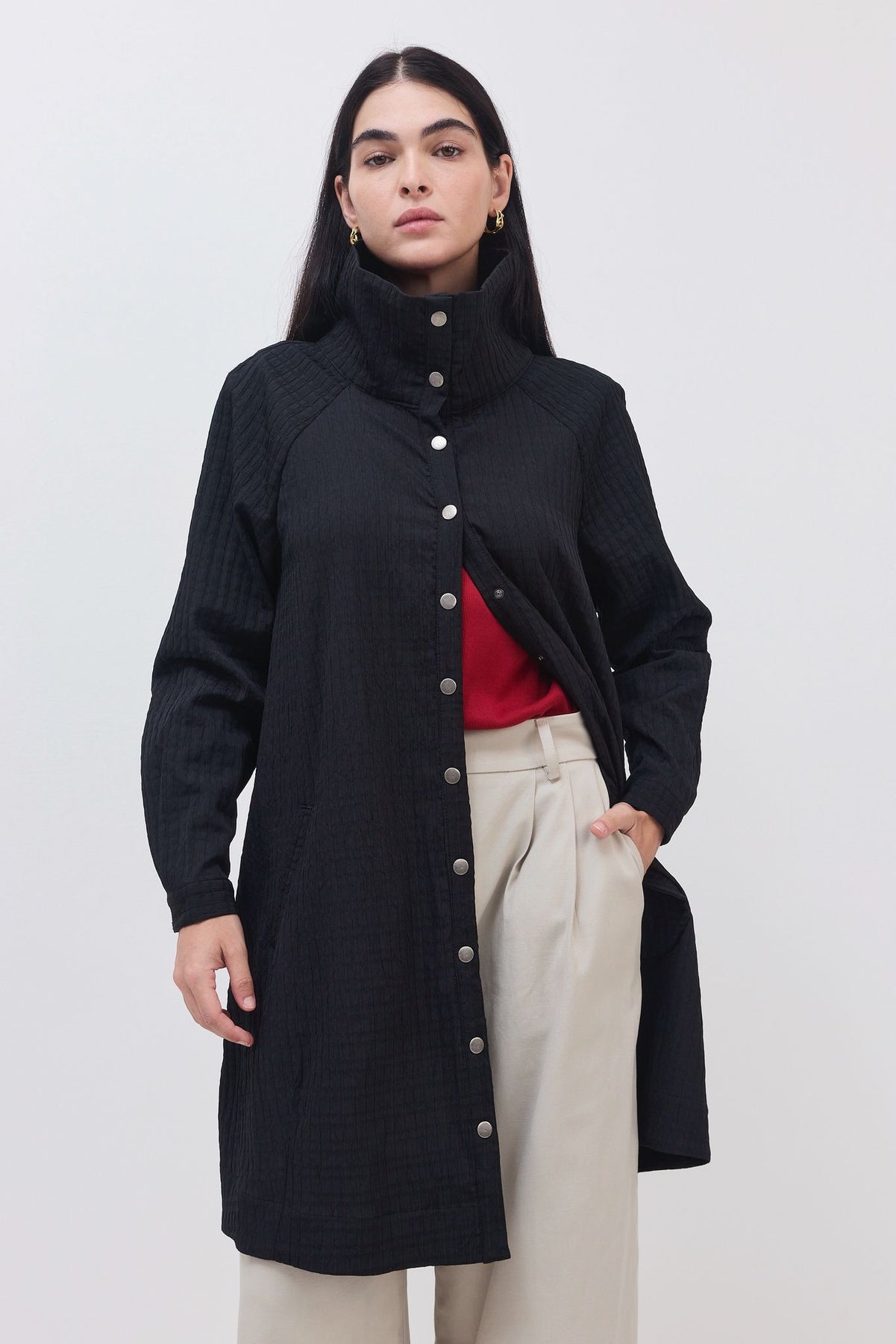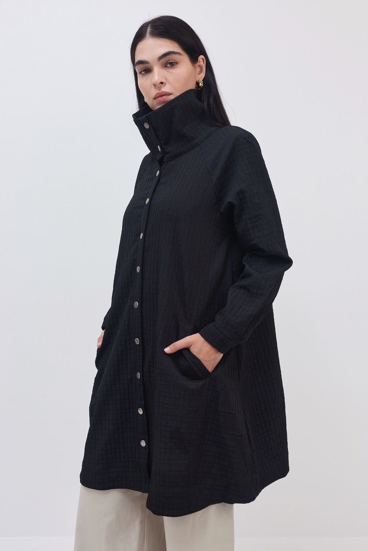 ג'קט דק בסגנון מעיל טראנץ, עם טקסטורה עדינה של ריבועים.