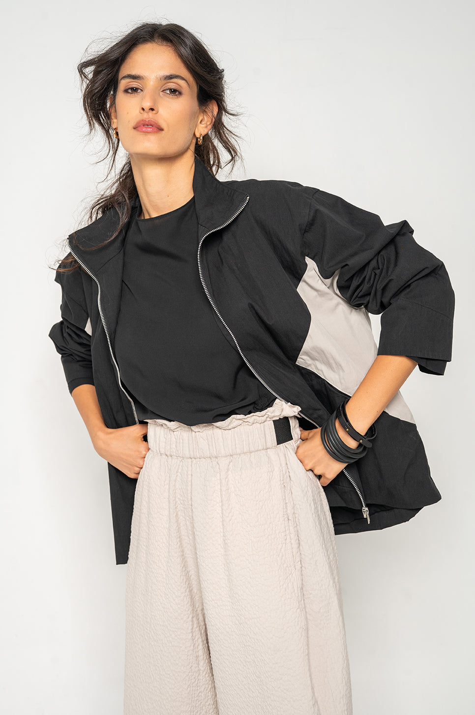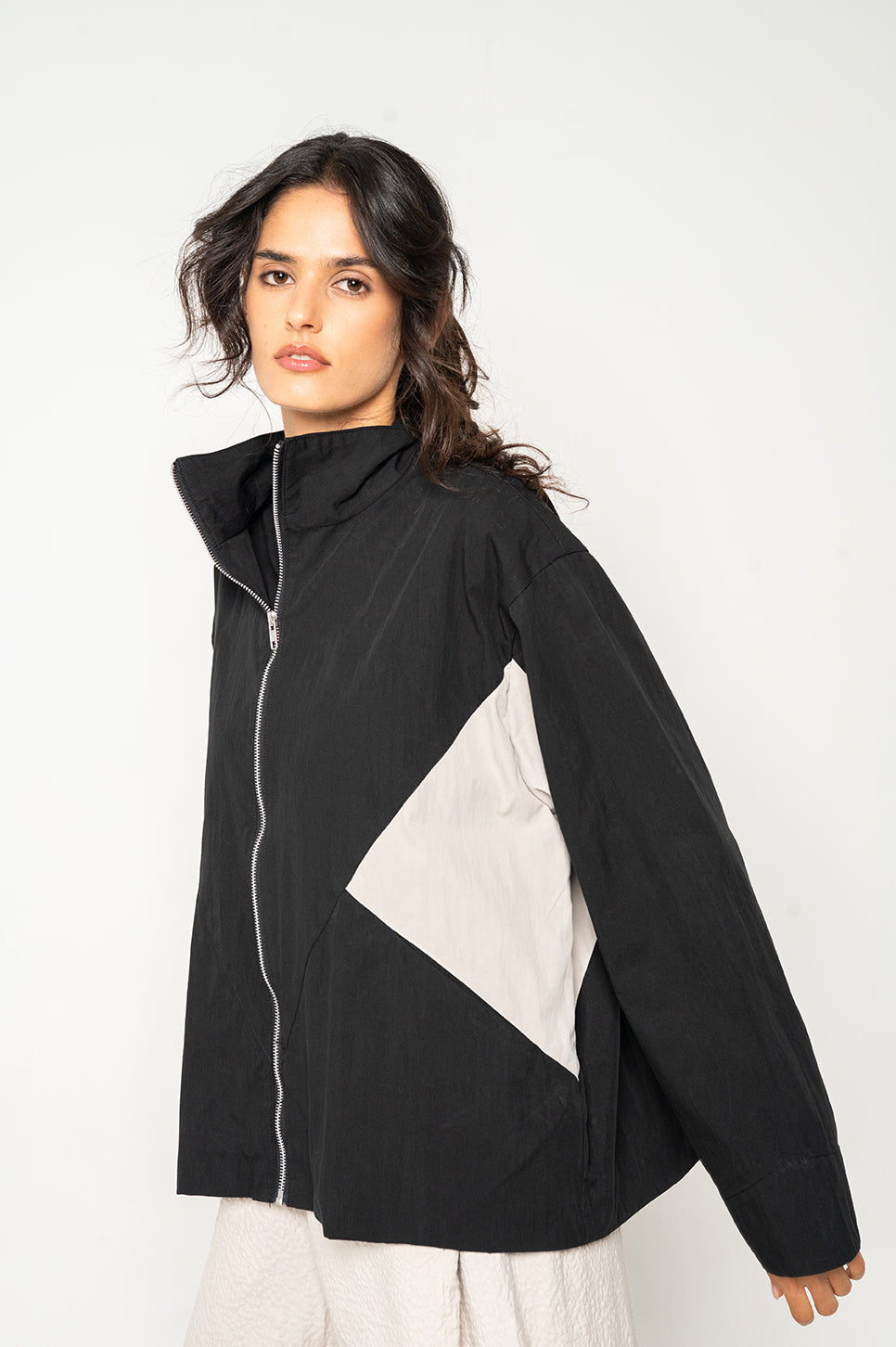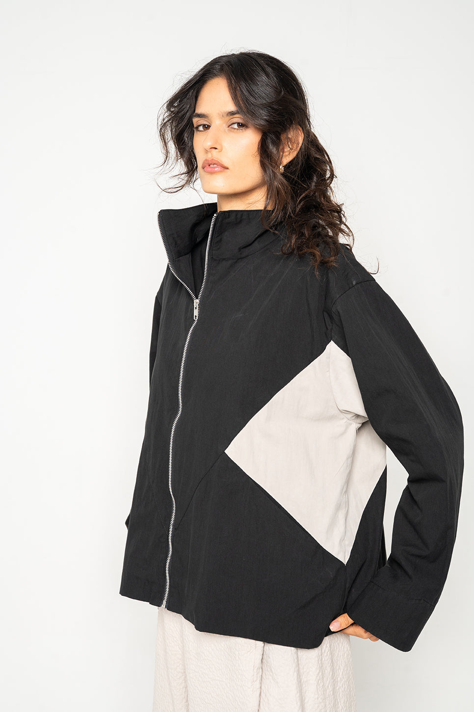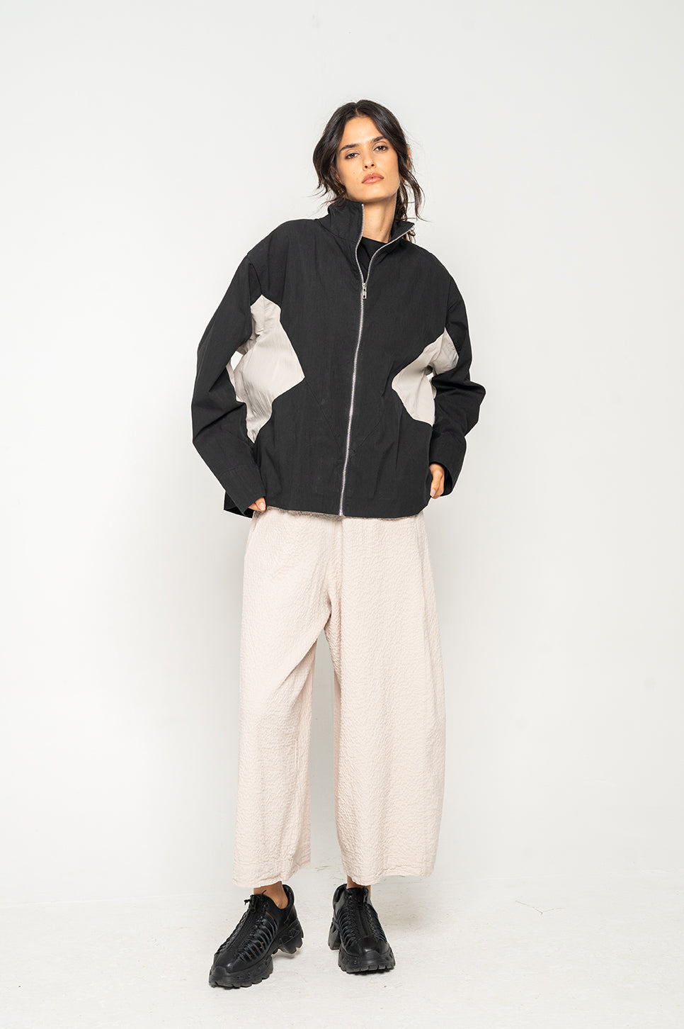 ג'קט קצר בגזרה ישרה עם חיתוכים גרפיים ולוק יוניסקס.
