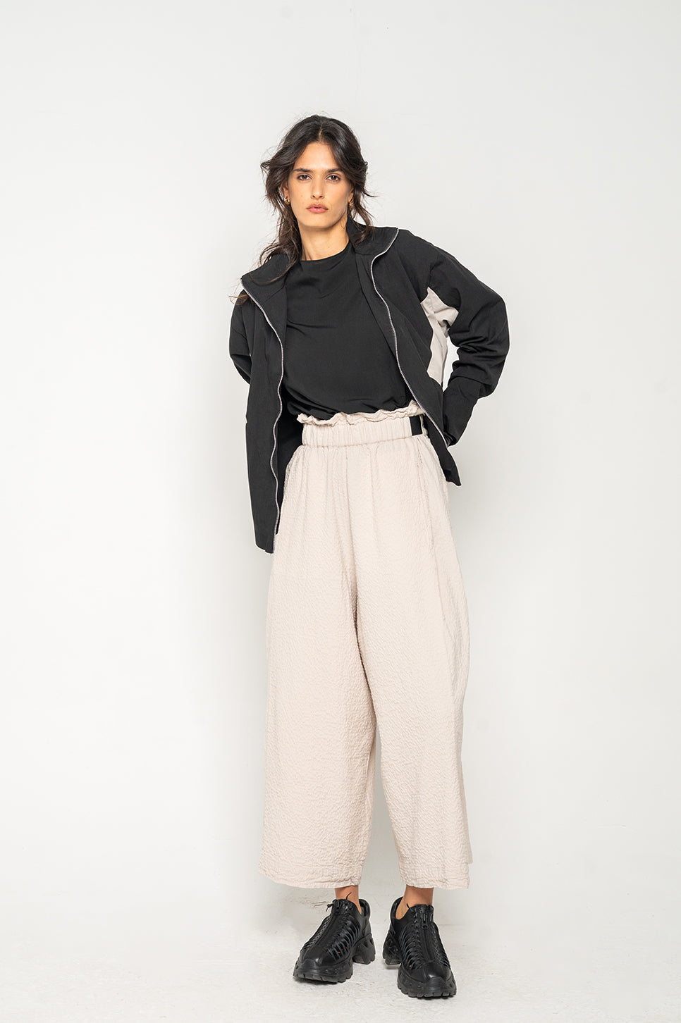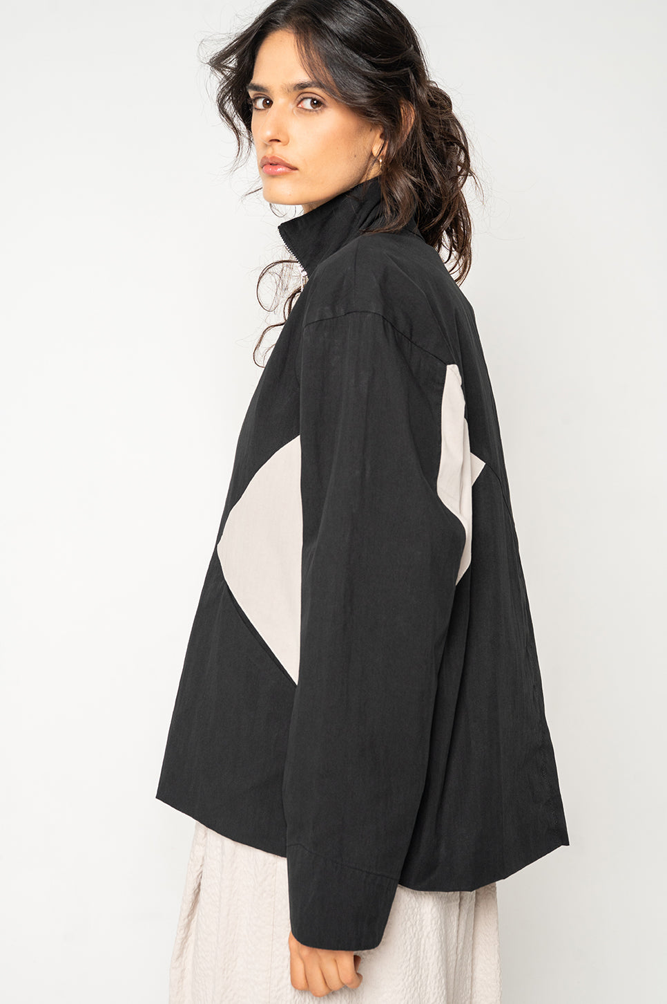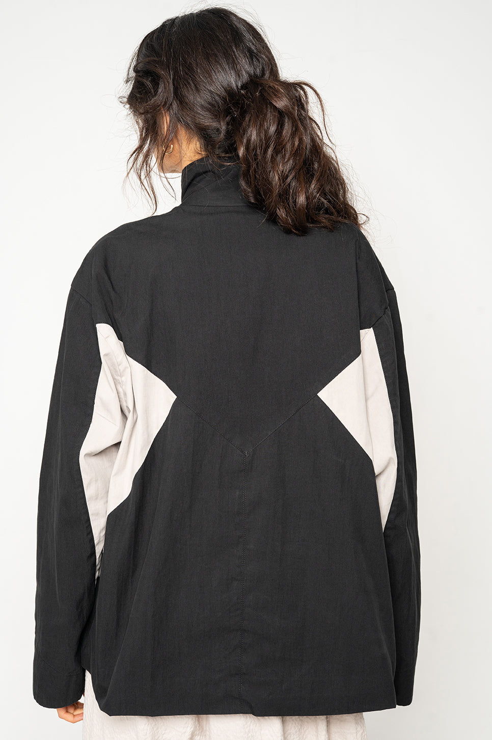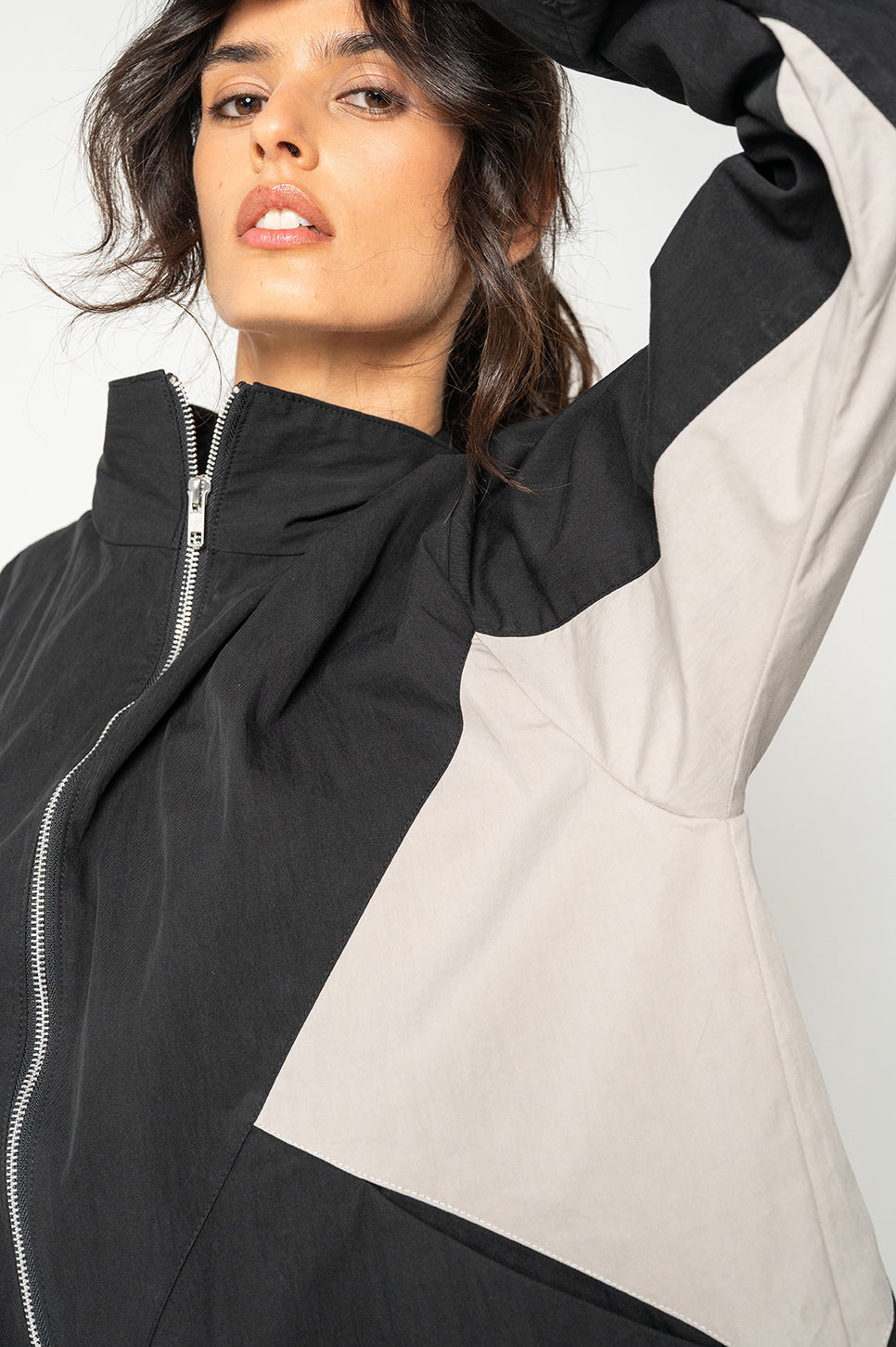ג'קט קצר בגזרה ישרה עם חיתוכים גרפיים ולוק יוניסקס.