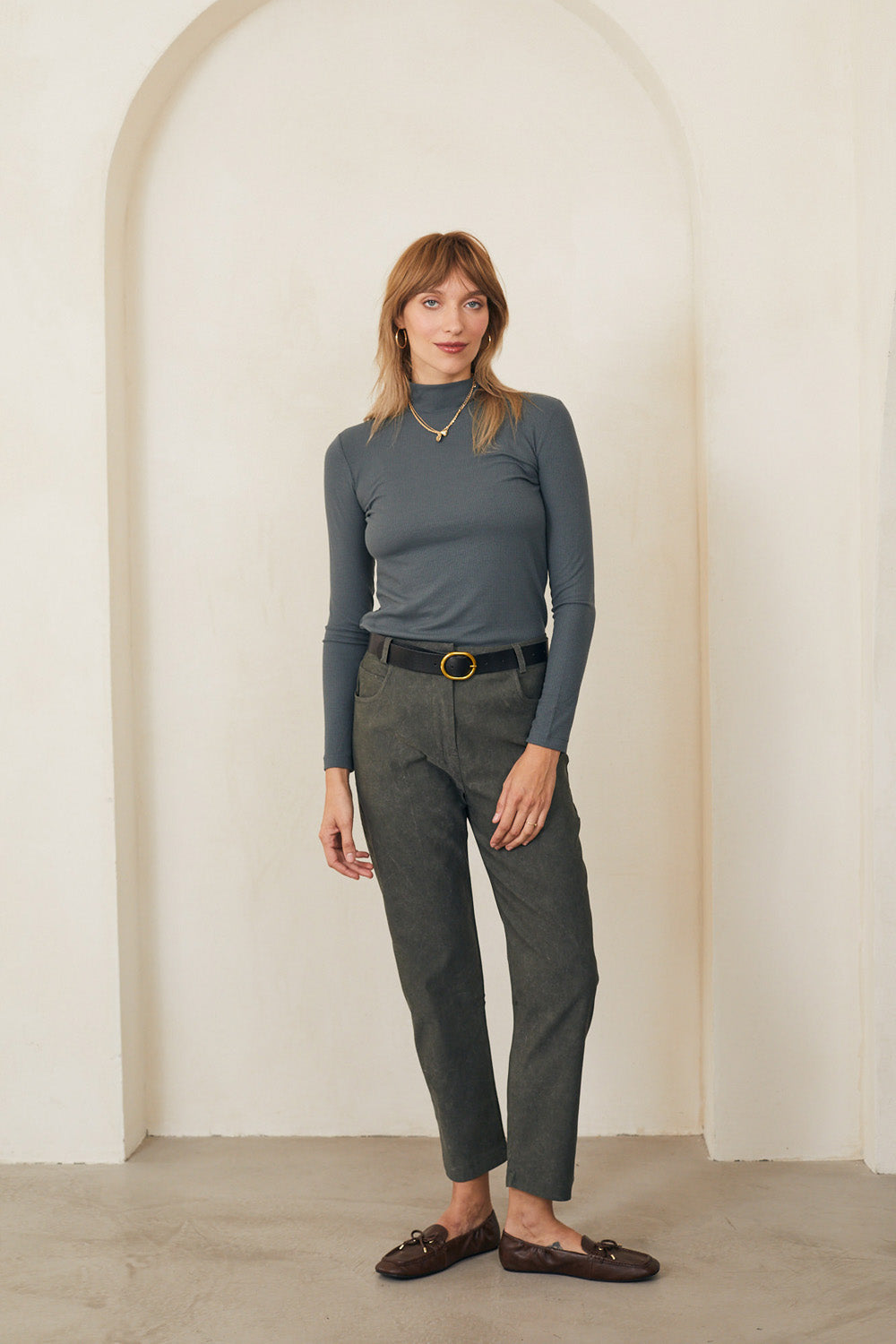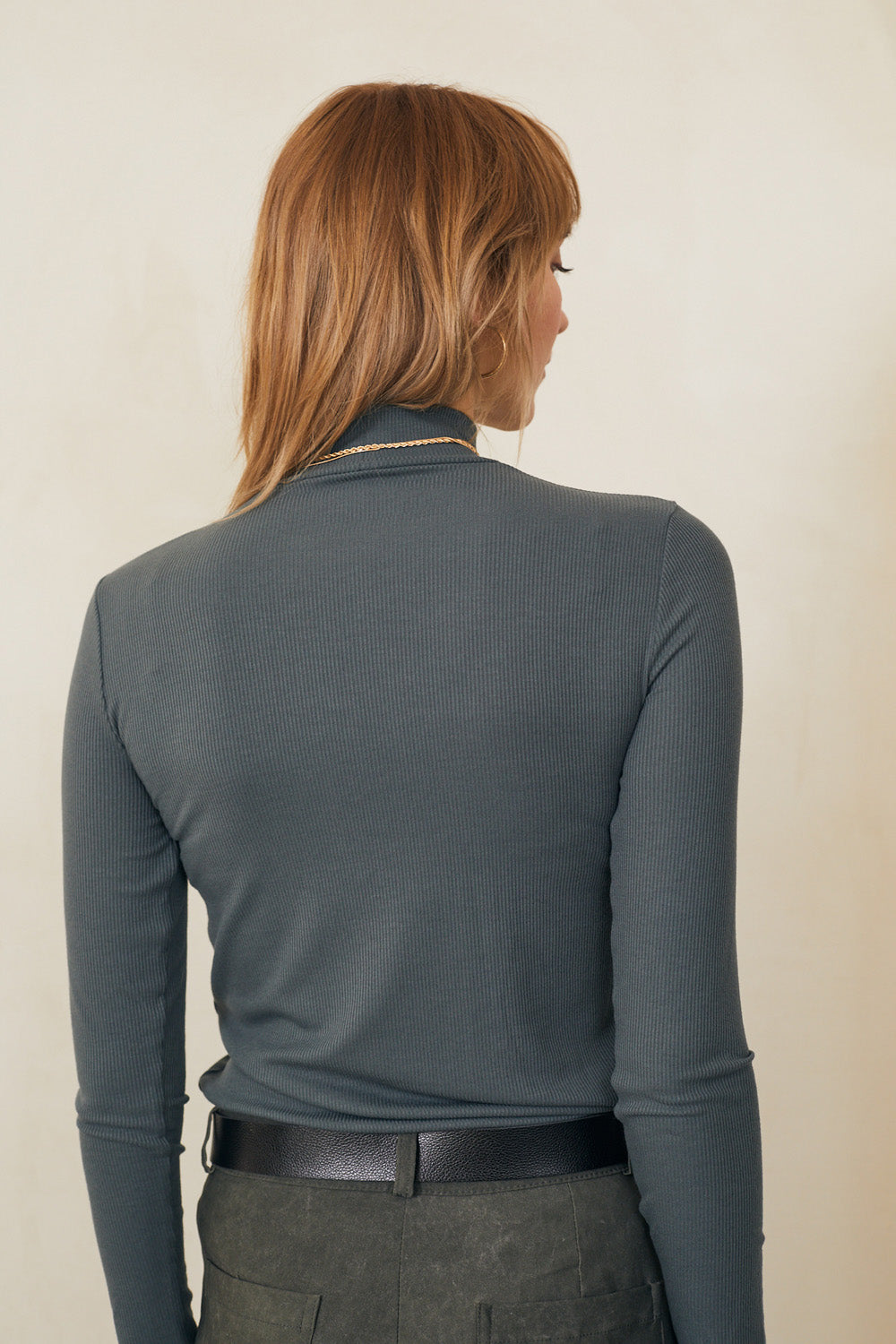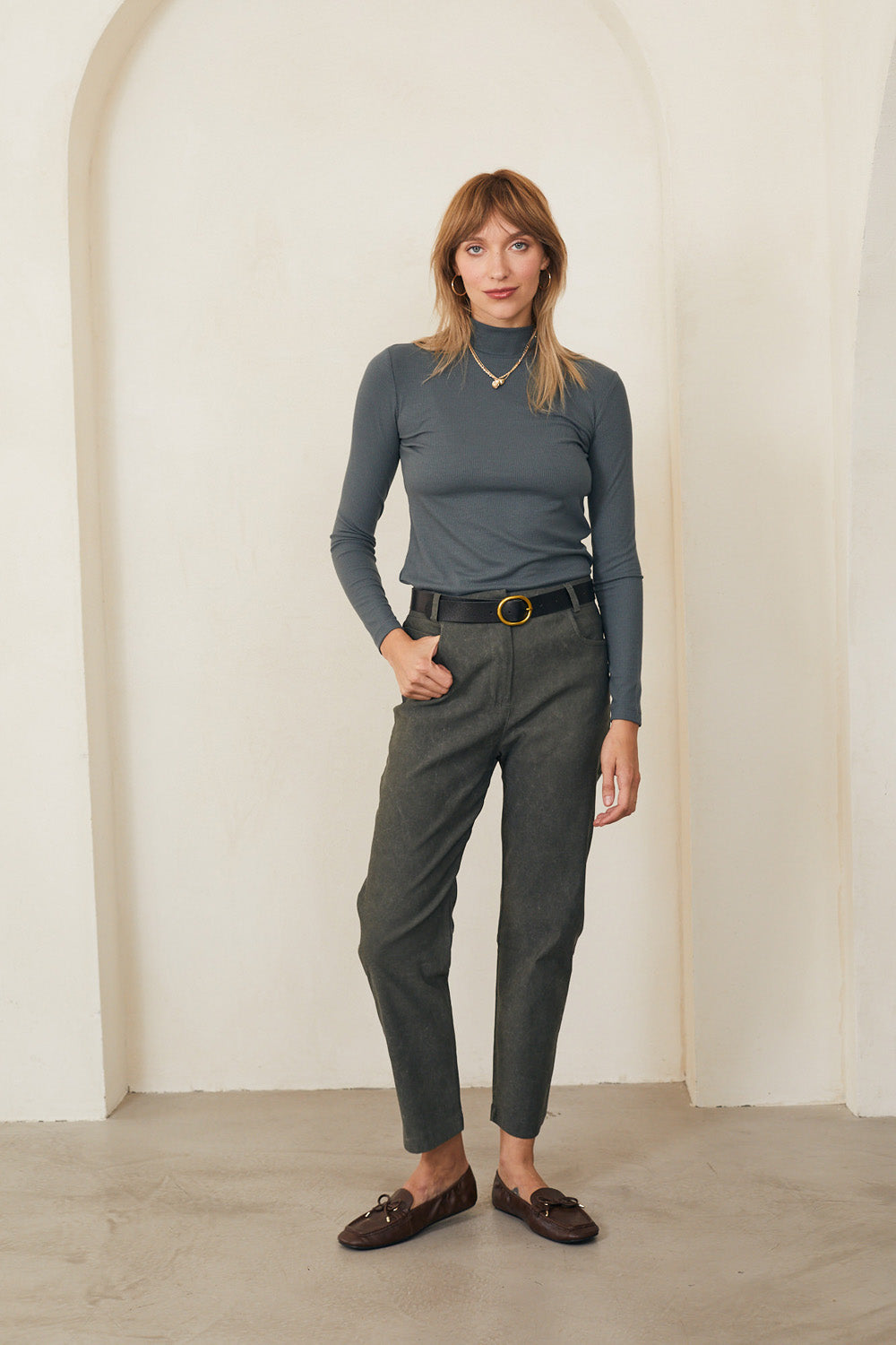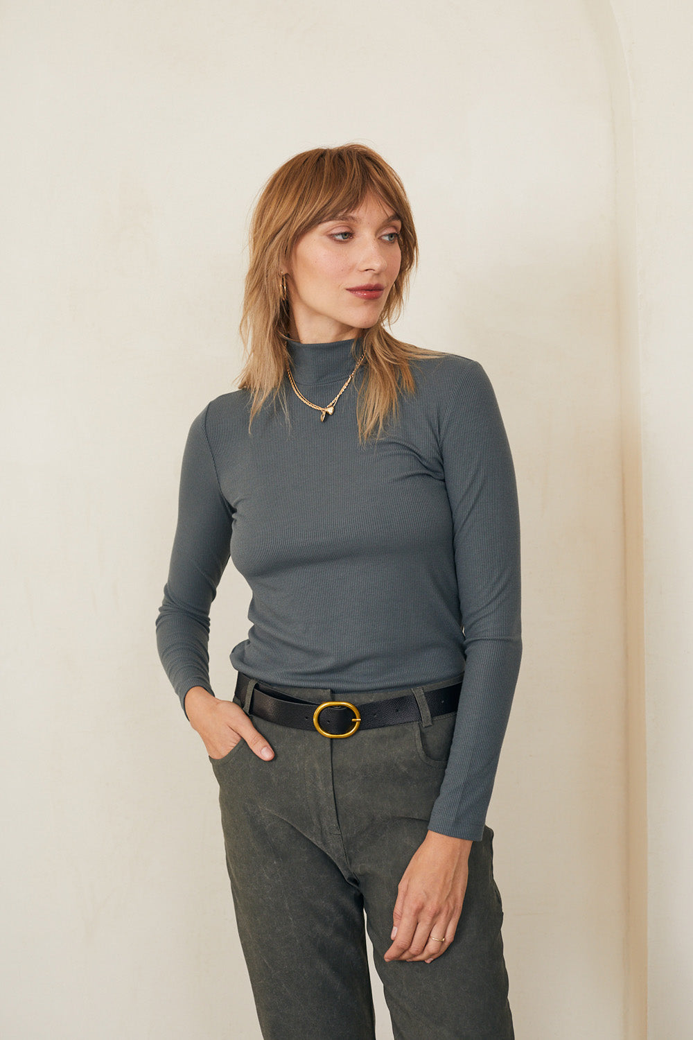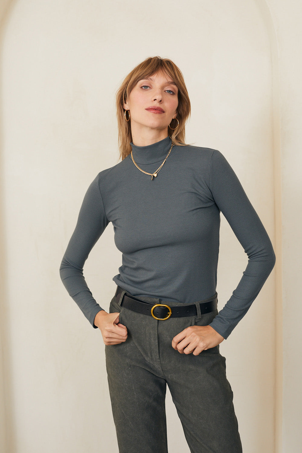 גזרה ישרה קרובה לגוף, עם שרוולים ארוכים וצווארון גולף.