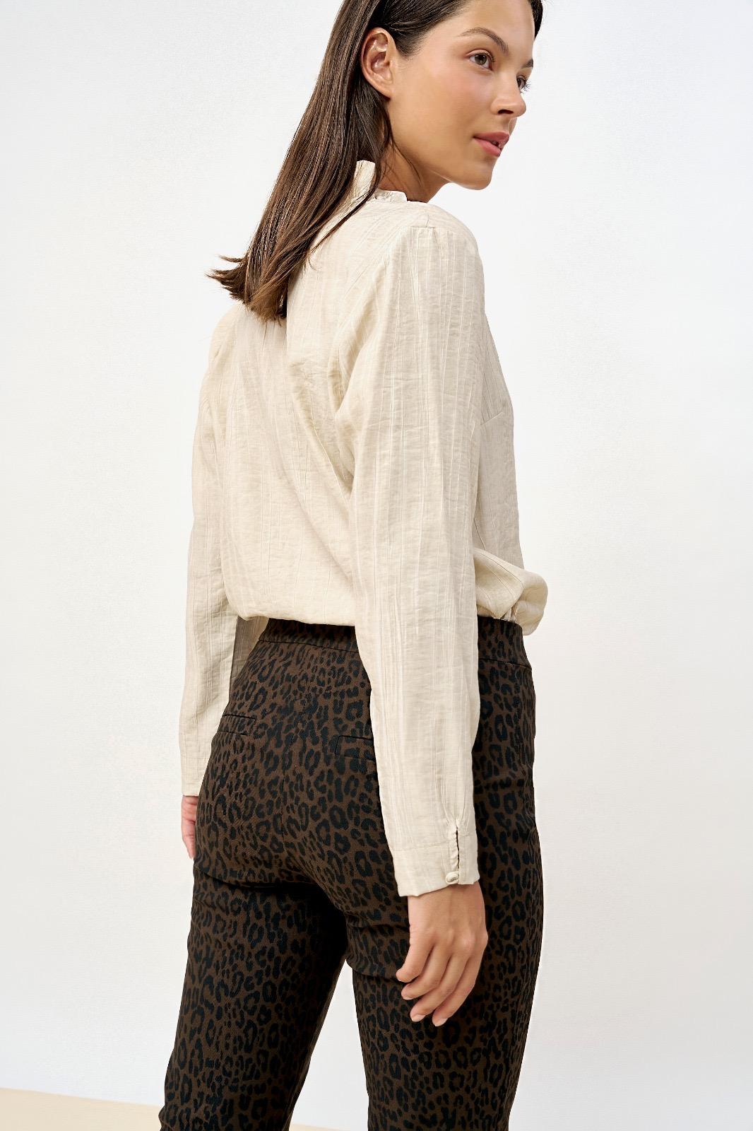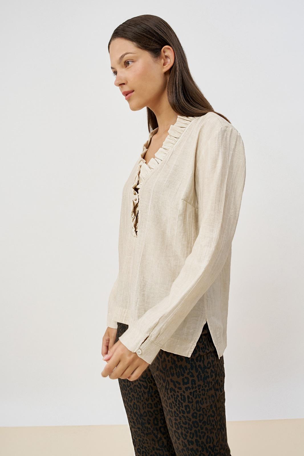 חולצת אריג עם מפתח וי וצווארון מלמלה עדין.