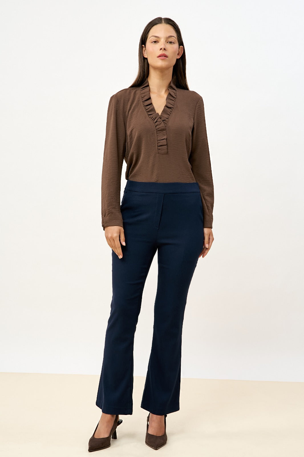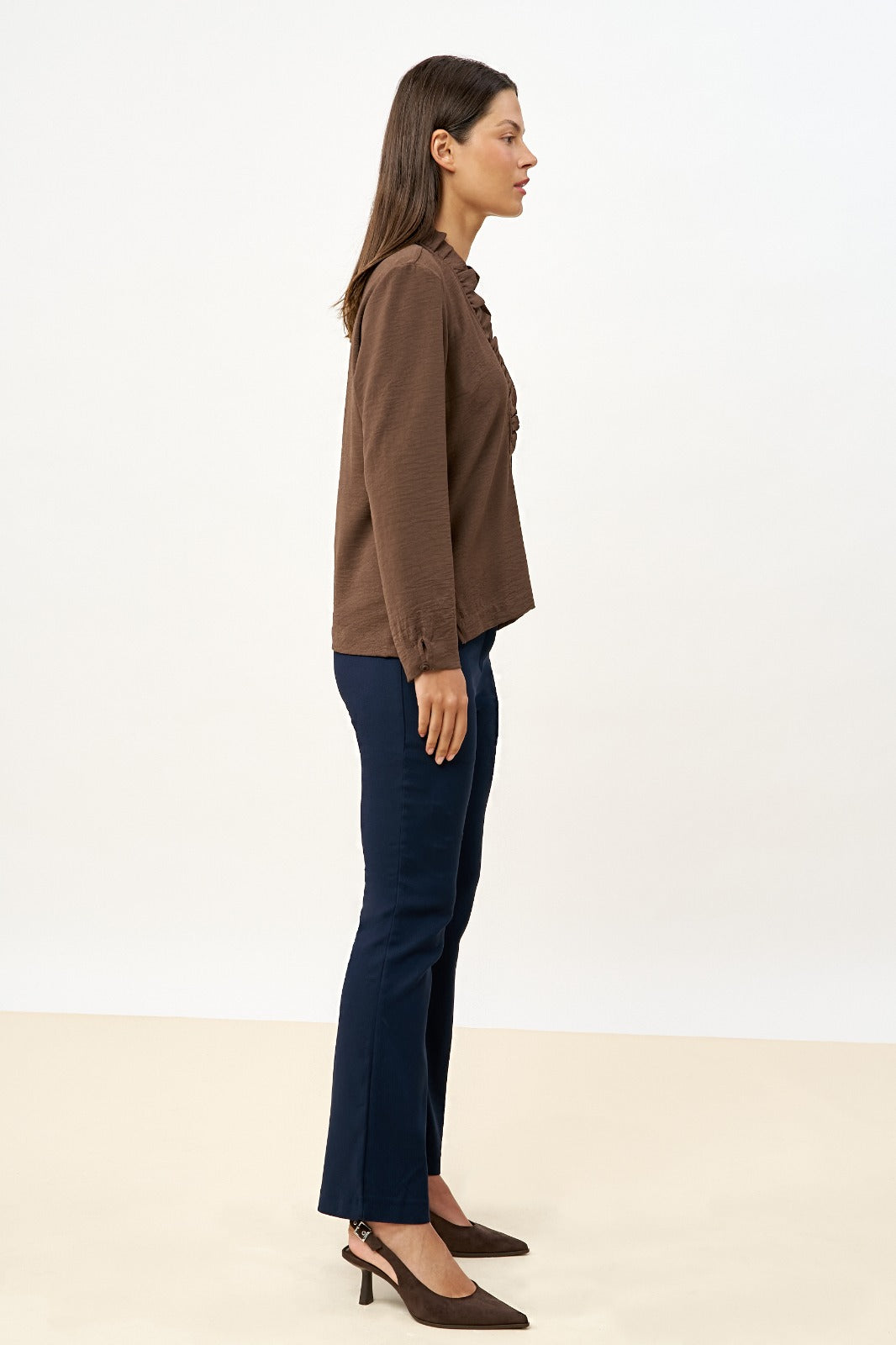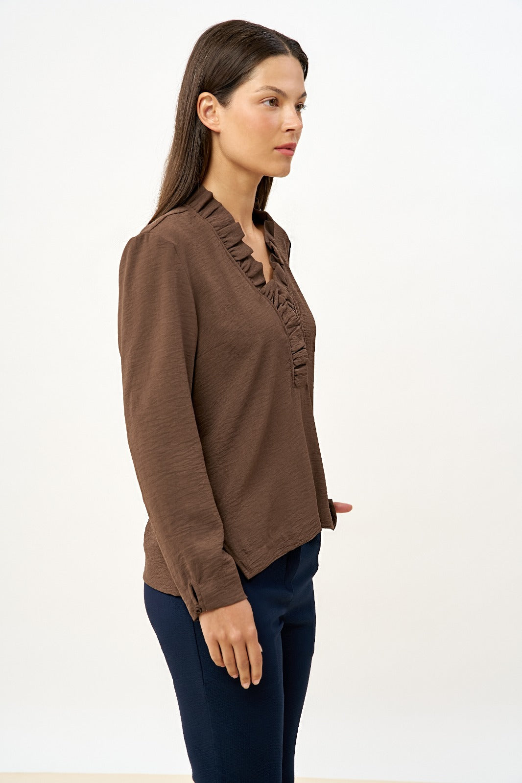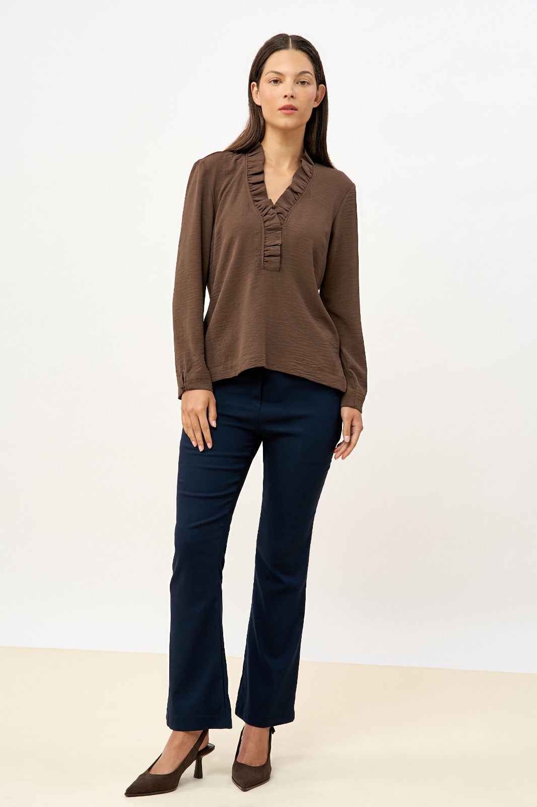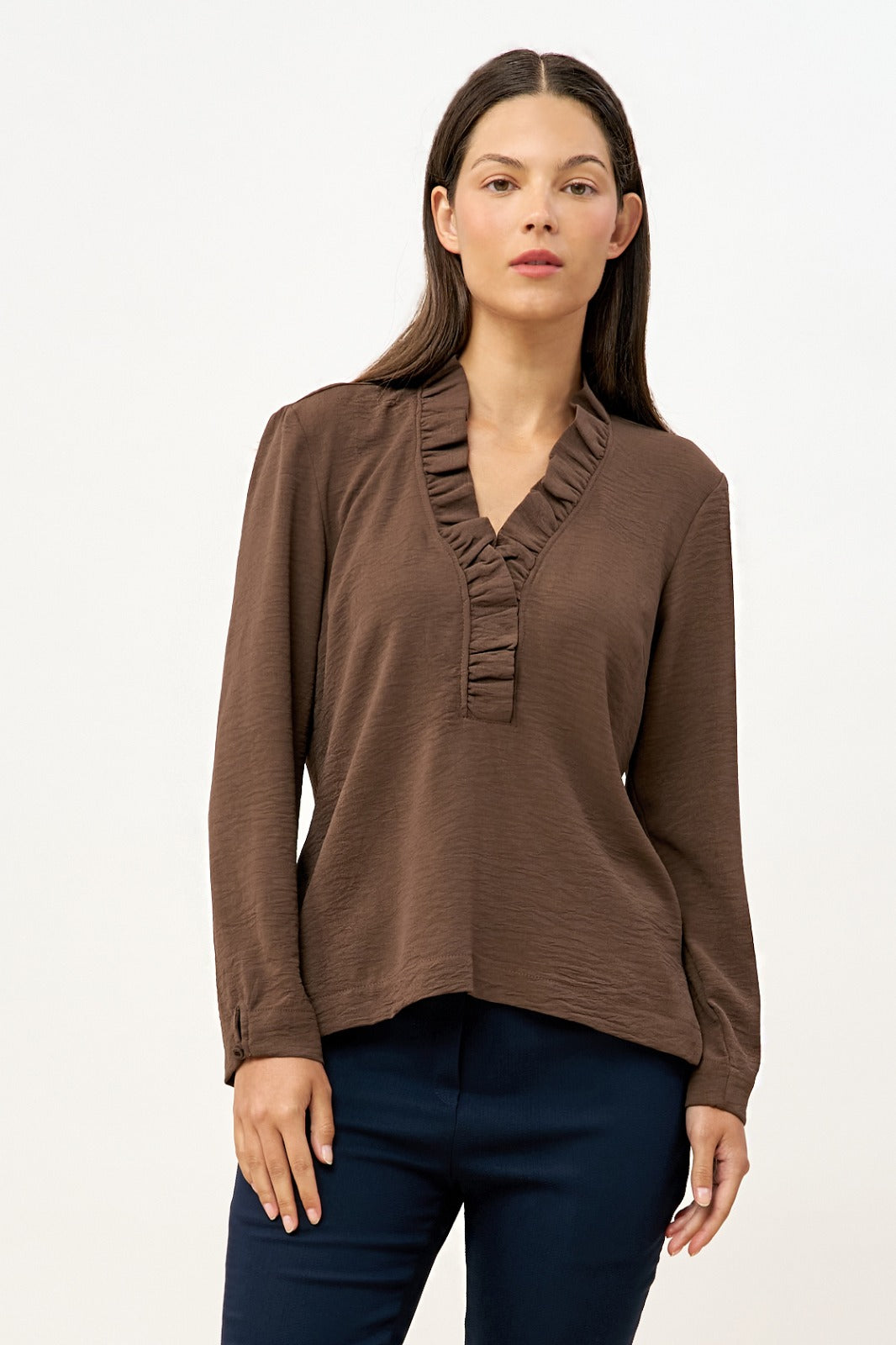 חולצת אריג עם מפתח וי וצווארון מלמלה עדין.