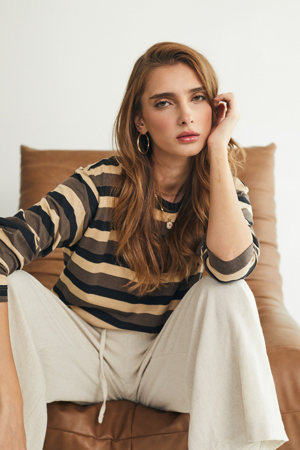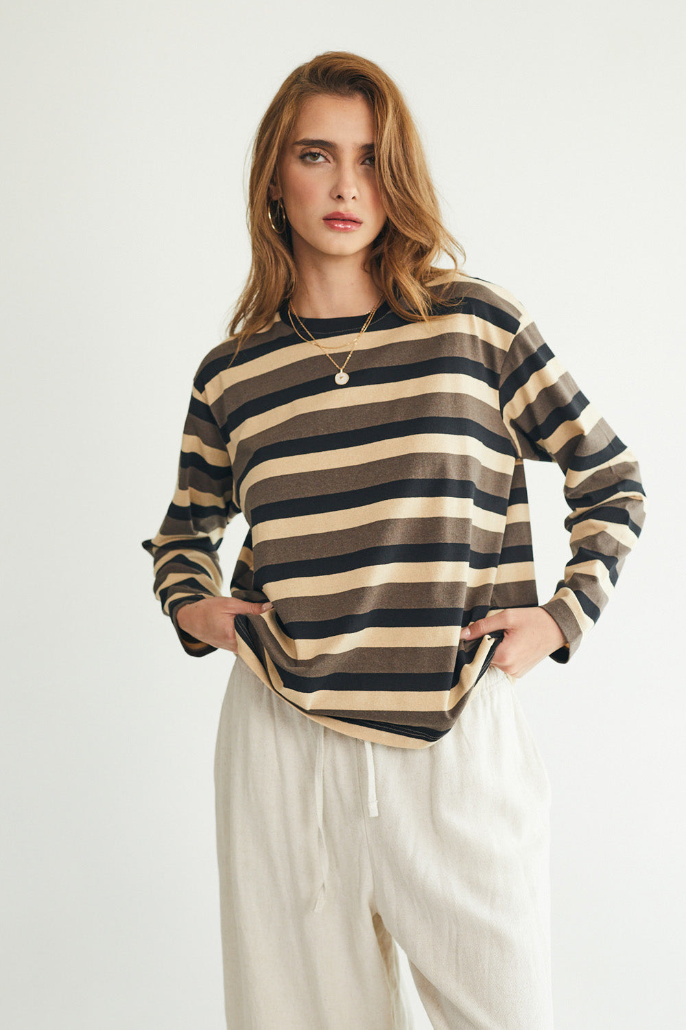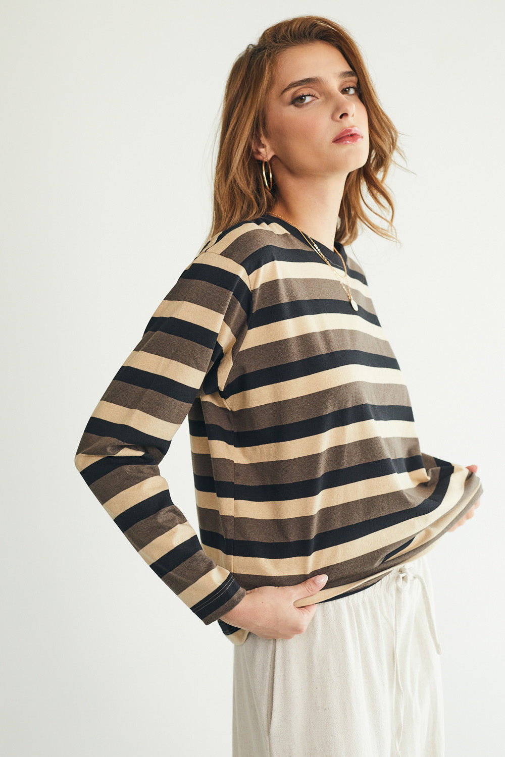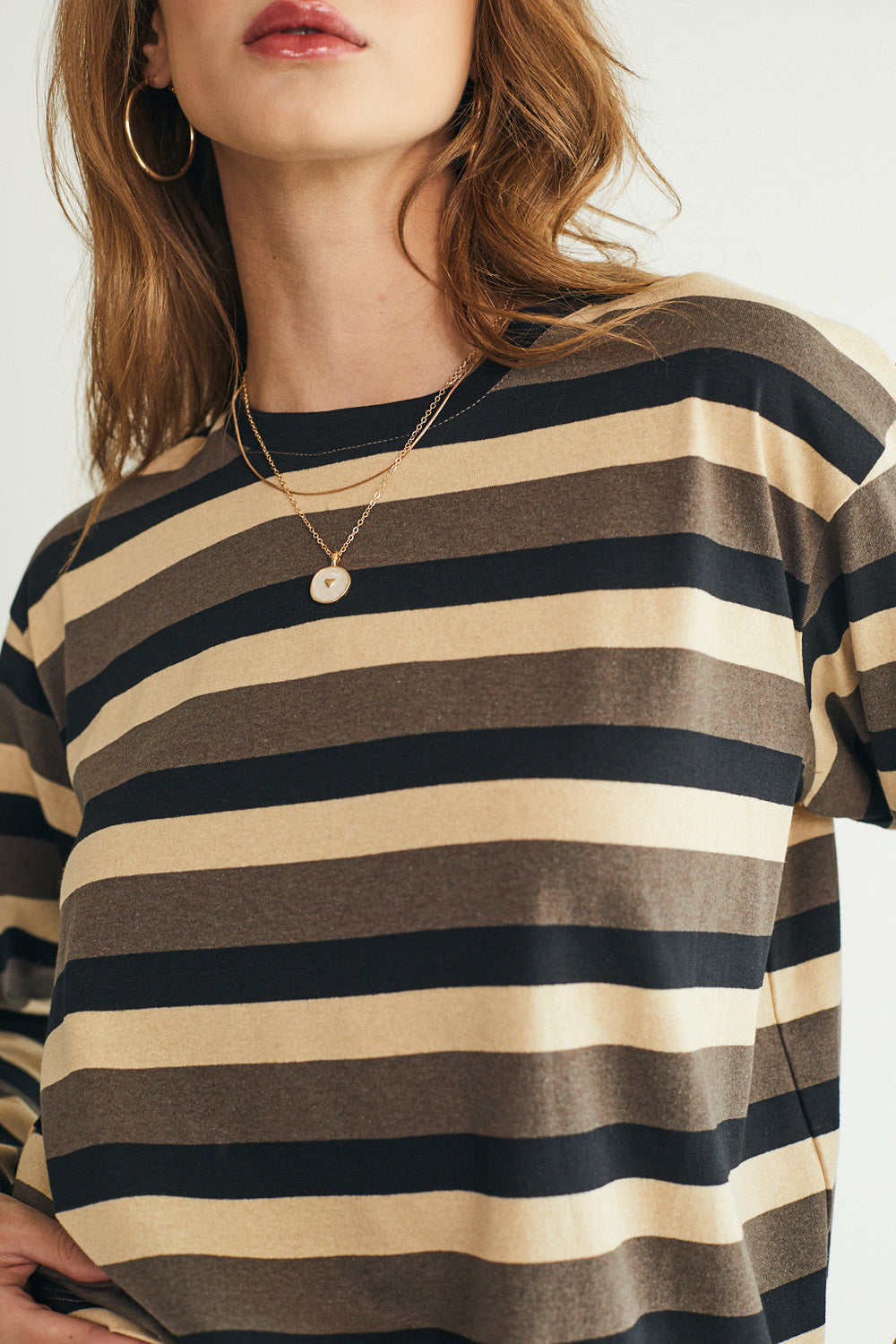 חולצת טי מושלמת ארוכה - פסים חומים