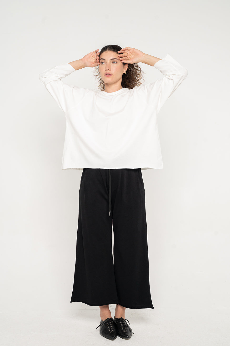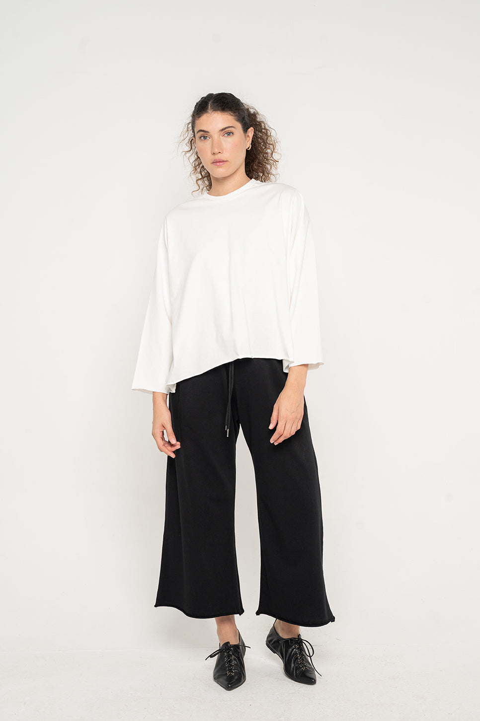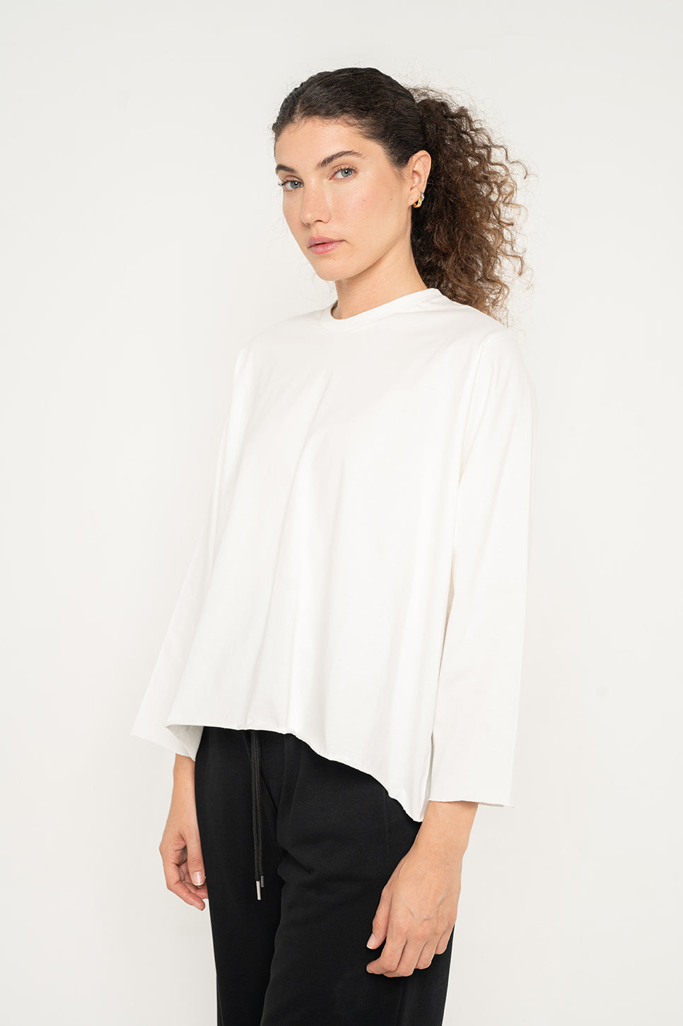 טישרט בגזרה בוקסית קצרה וישרה, עם שרוולי 3/4.
