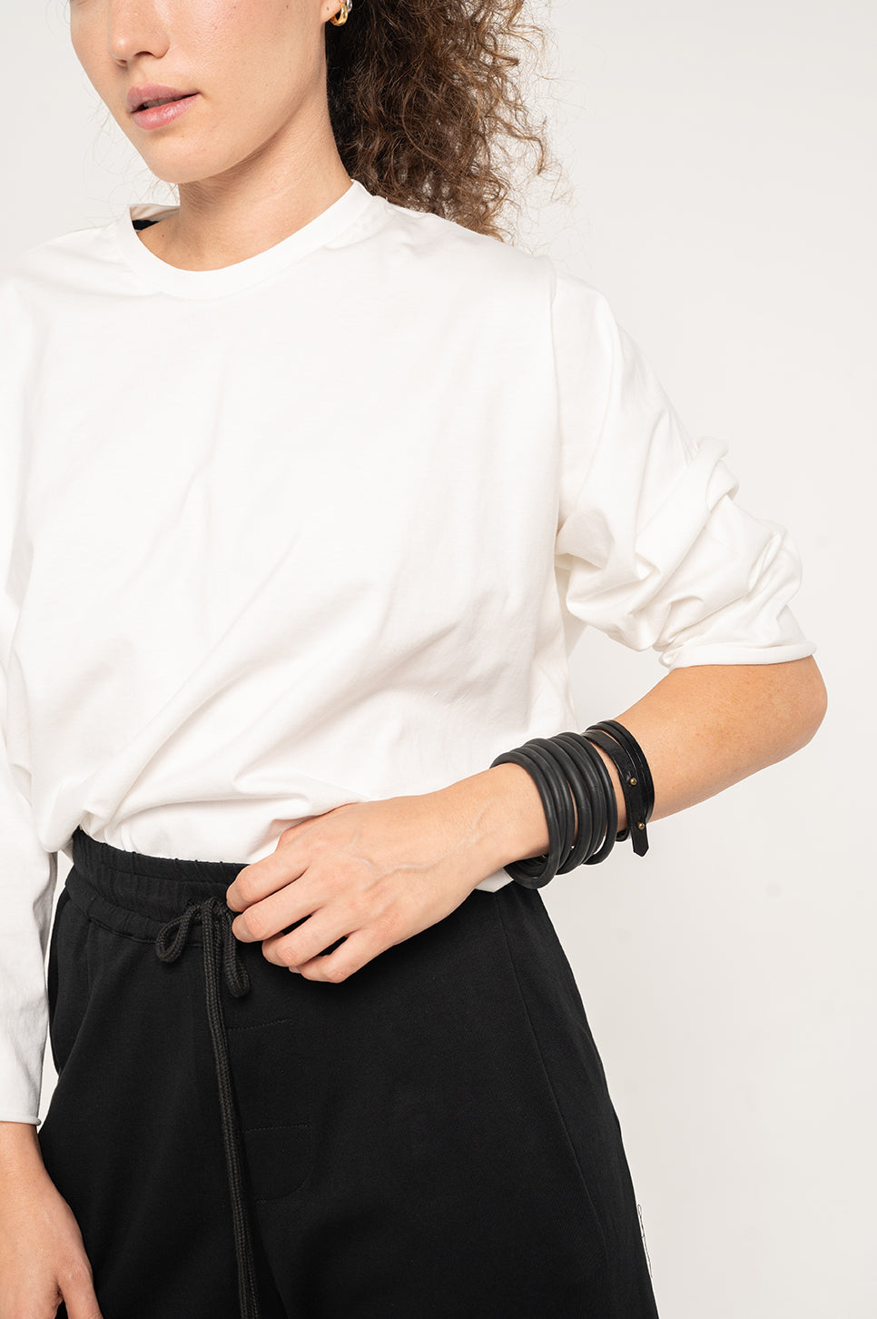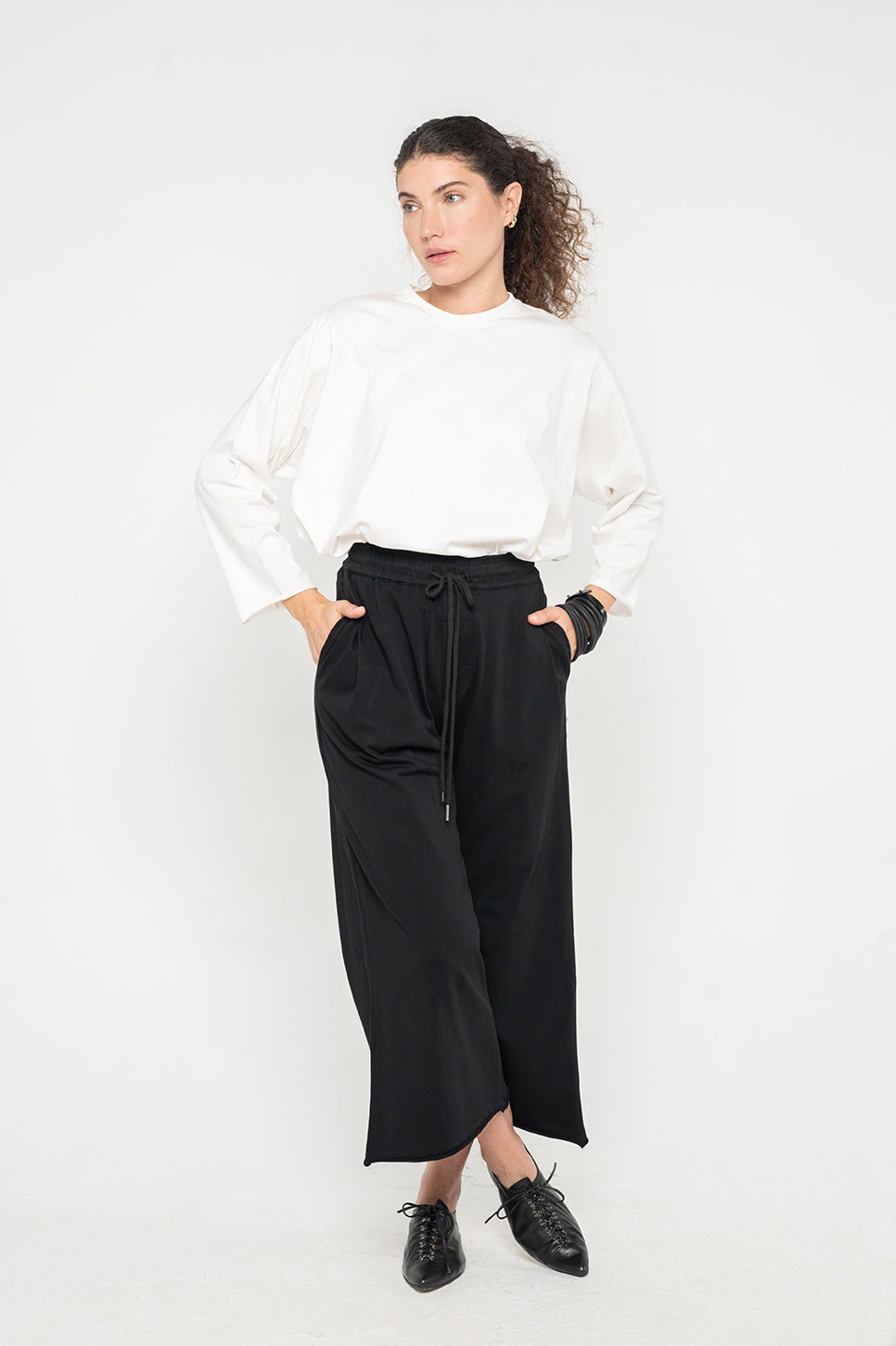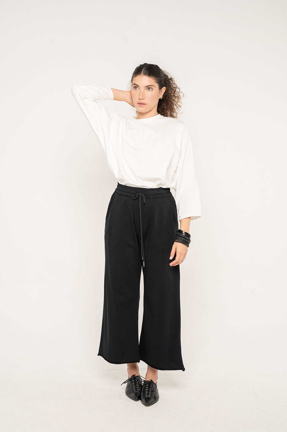 טישרט בגזרה בוקסית קצרה וישרה, עם שרוולי 3/4.