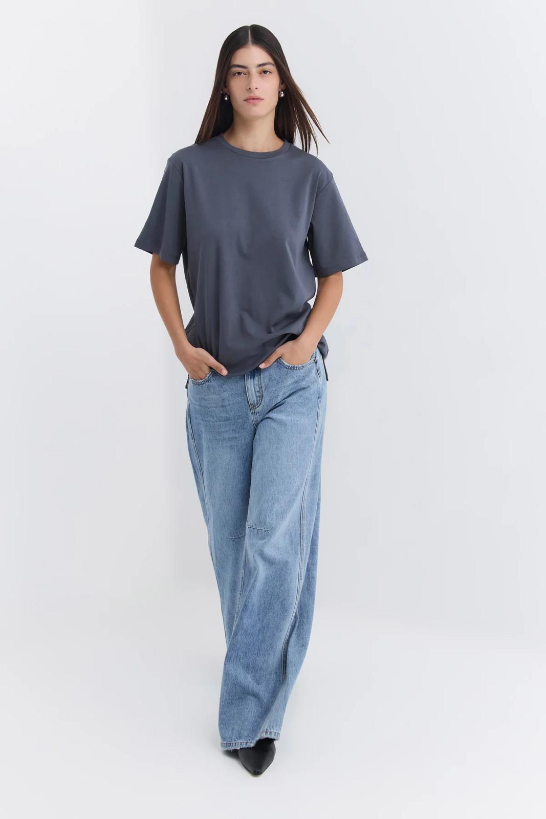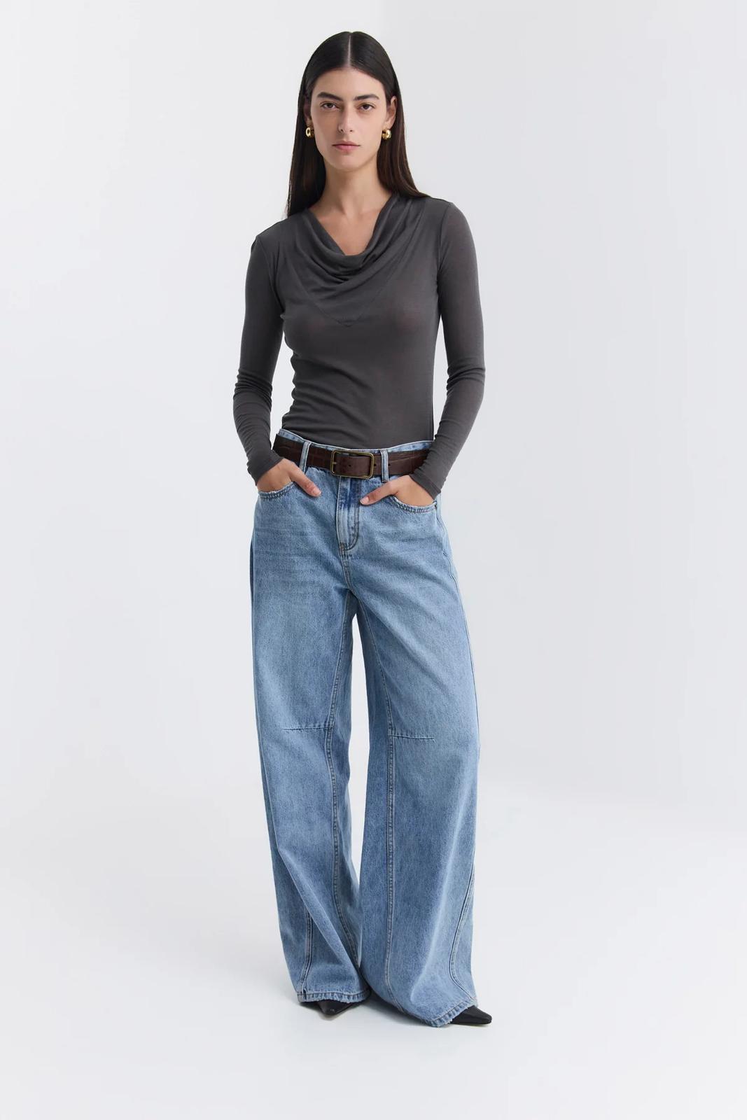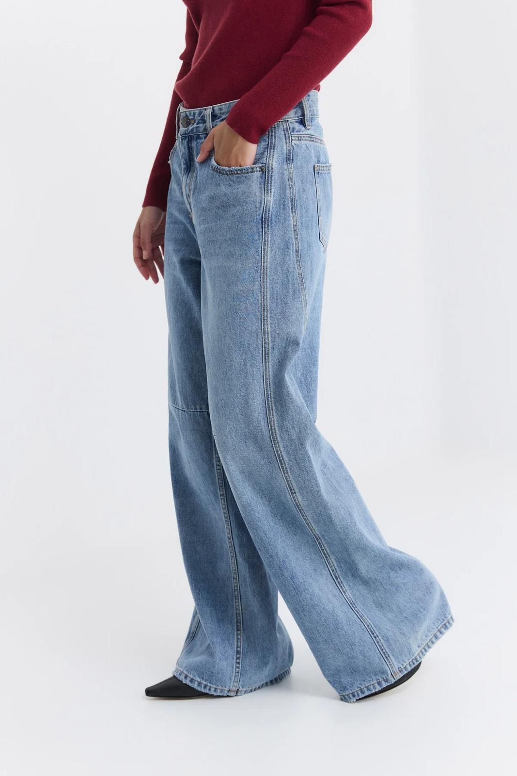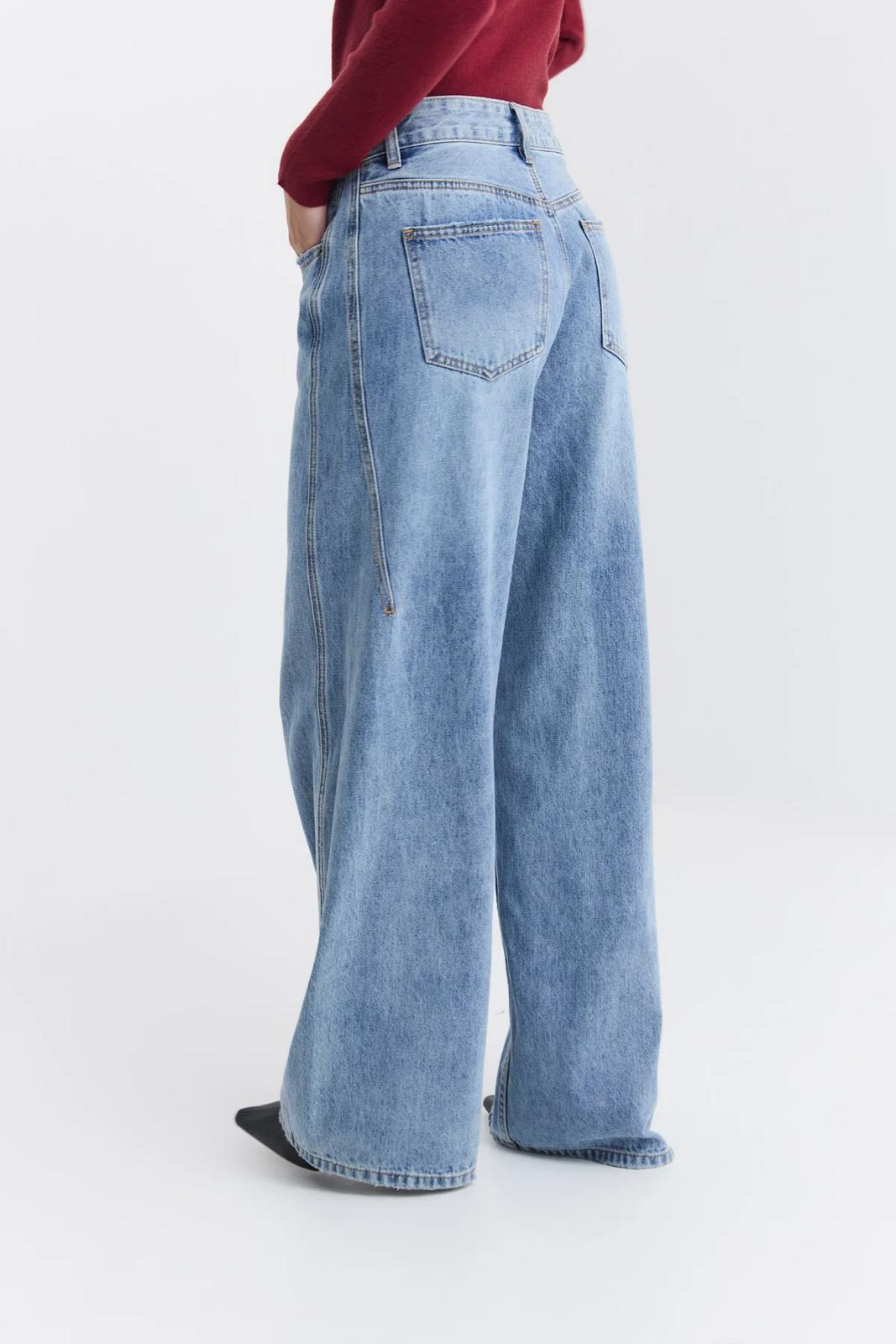 מכנסי ג'ינס רחבים בגזרה רחבה. עשויים דנים כותנה עם שטיפה עדינה, לסטייל יומיומי ונינוח. לגינס מותן גבוהה , כיסים קדמיים ואחוריים קלאסיים ותפרים דקורטיביים שמעניקים טאץ מודני.