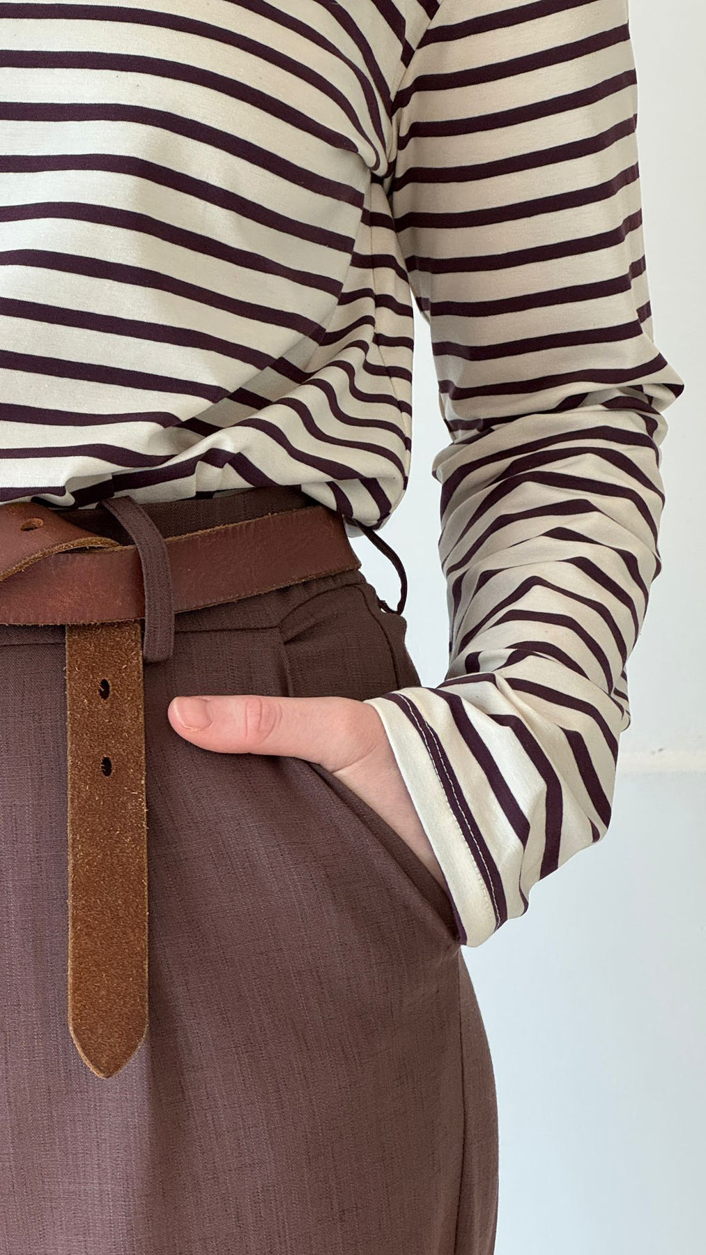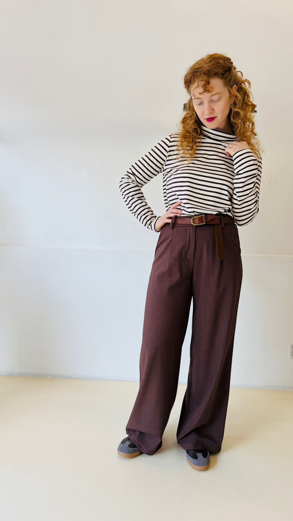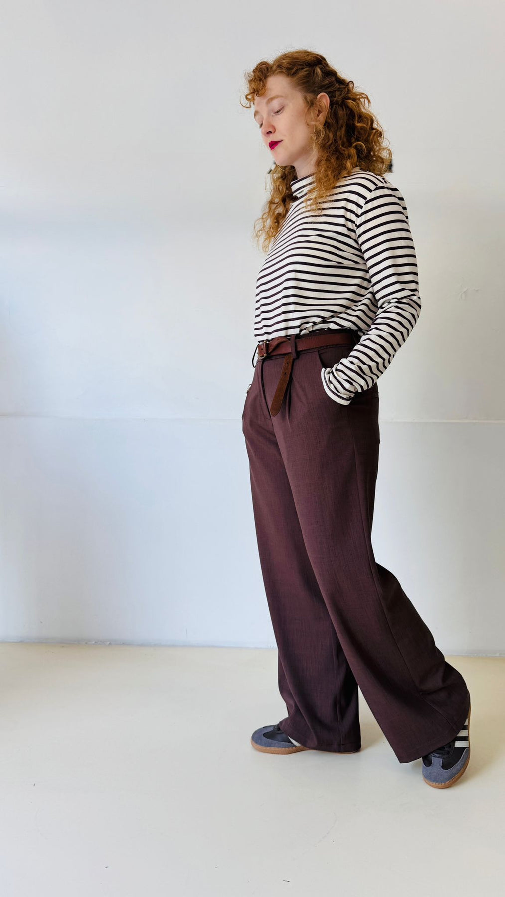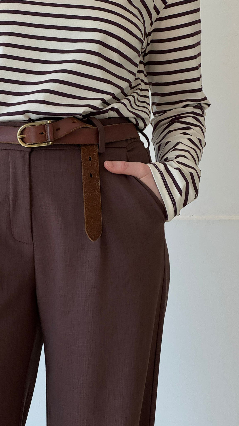מכנסיים מחויטים עם קפל שיוצא מהמותן בבד אל קמט בגוון חום.