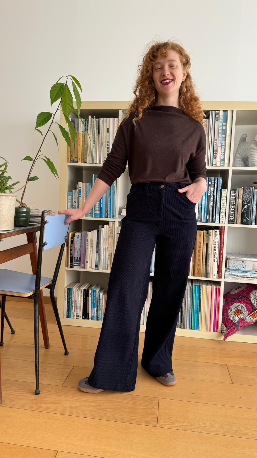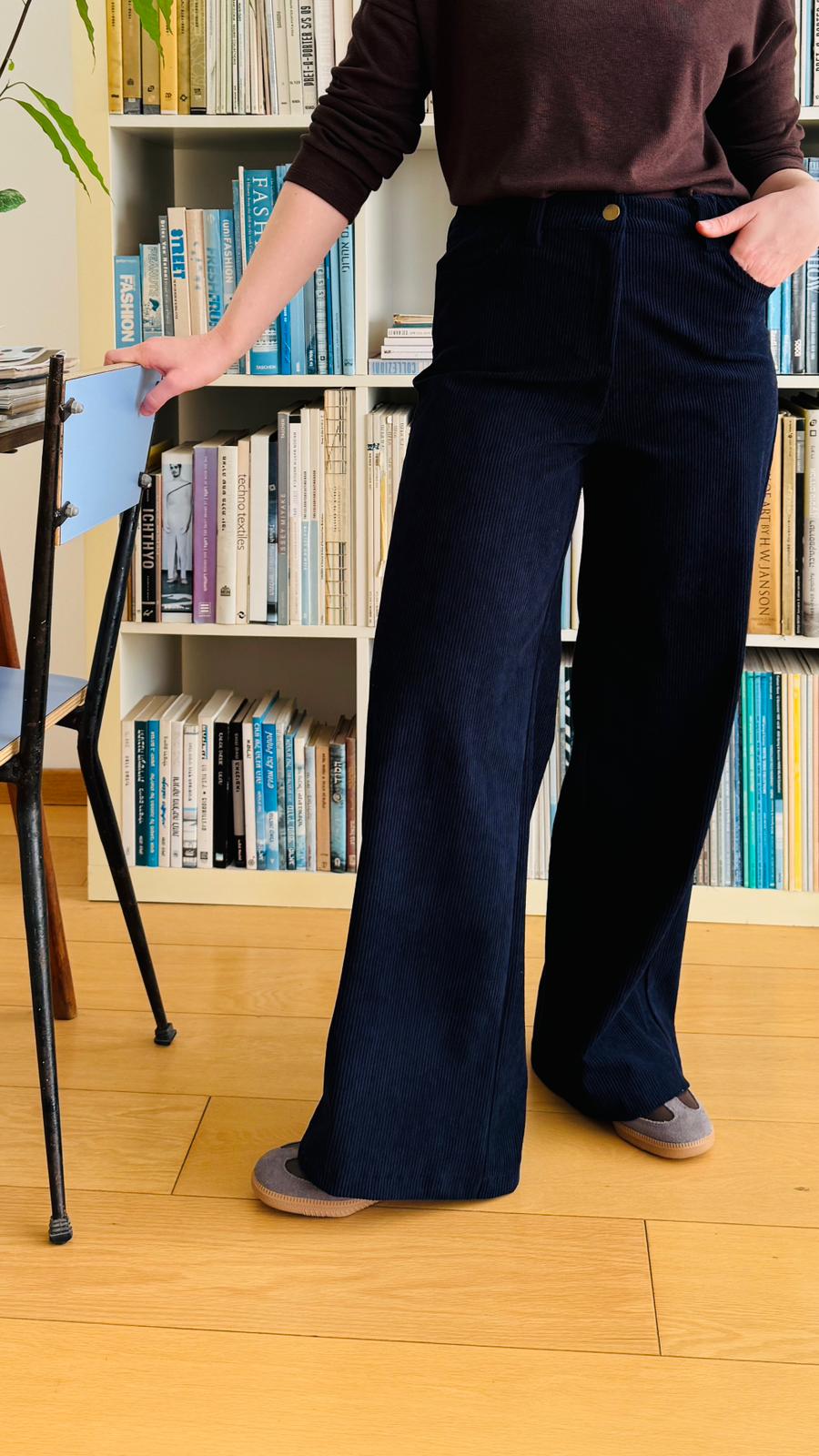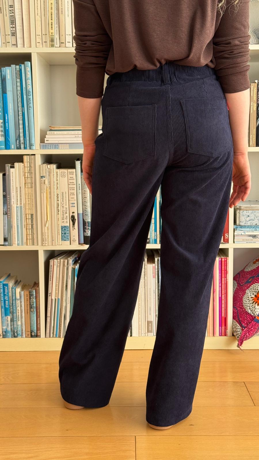 מכנסיים חתיכיים ומתרחבים מקורדרוי כחול.