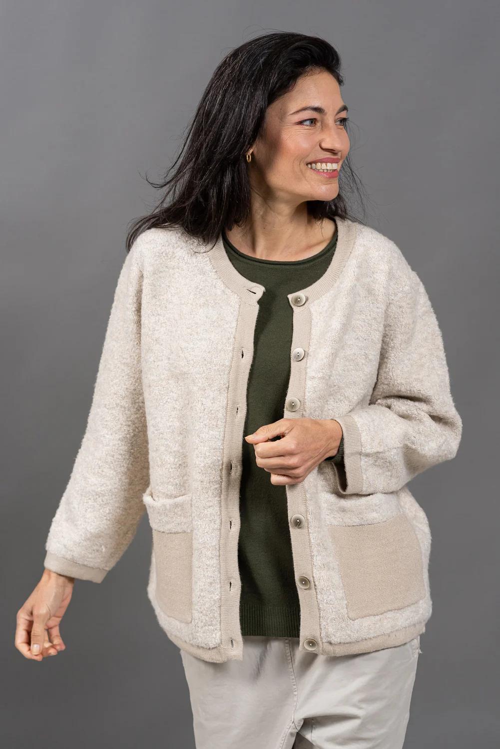 גימור בחתך טבעי , עדין ומתגלגל בצווארון, גימור ריב רחב בשרוולים ובמותן.