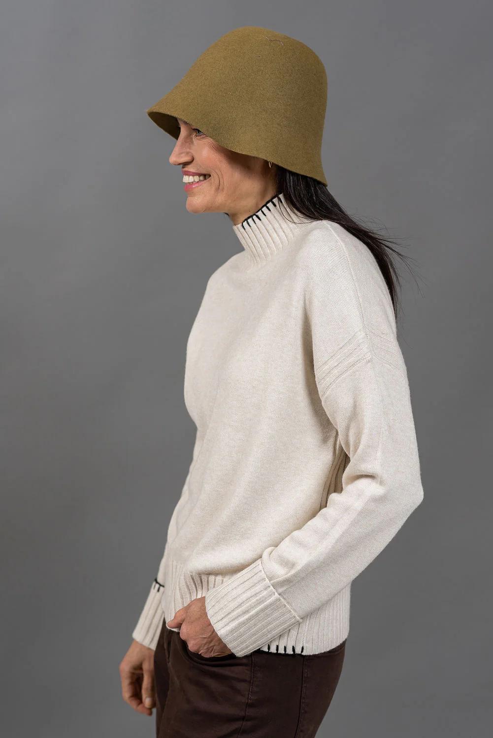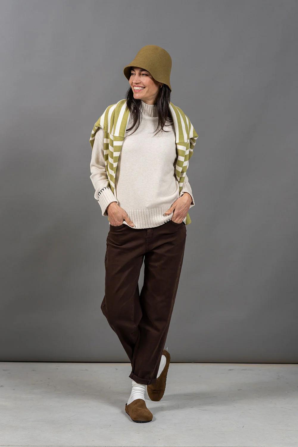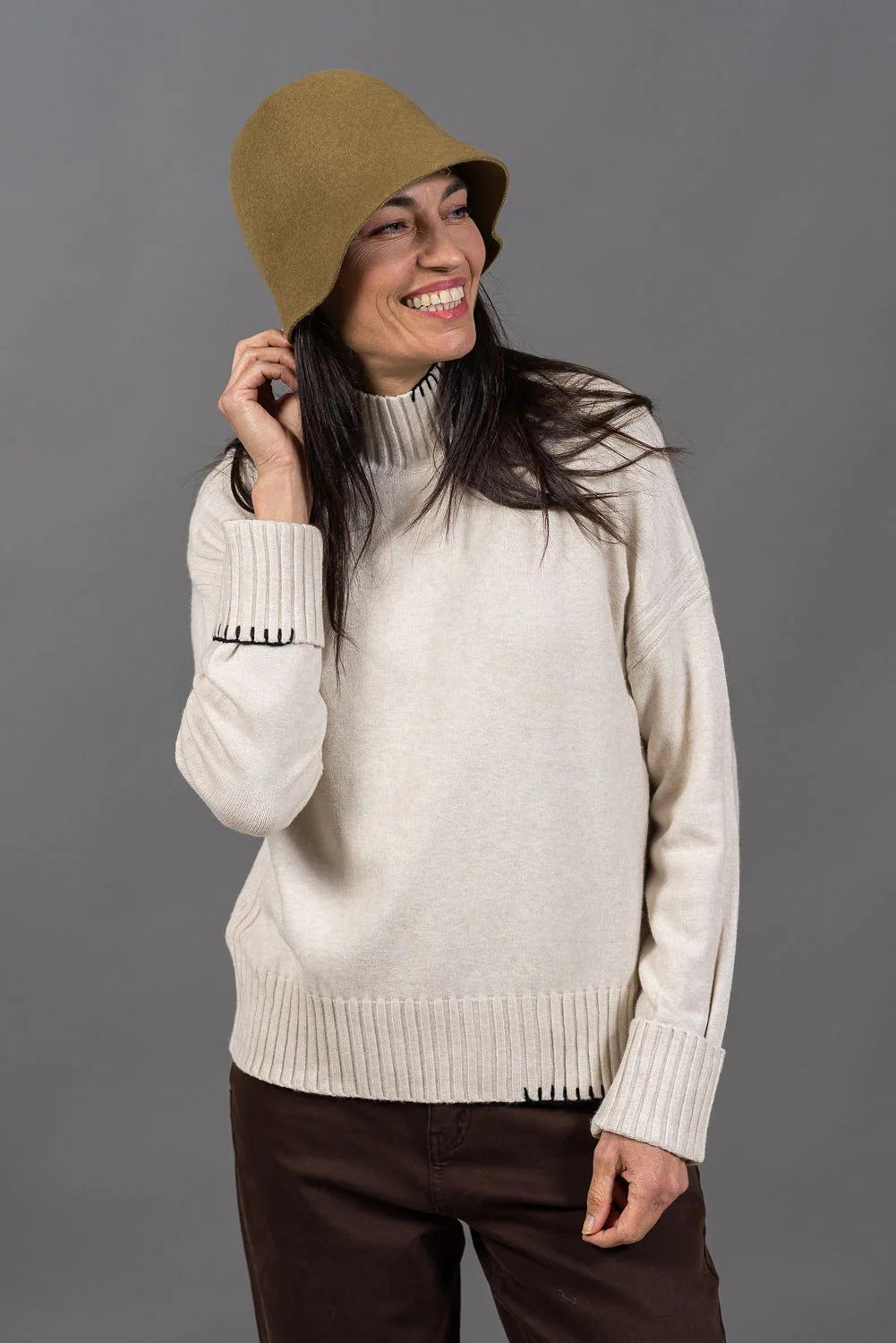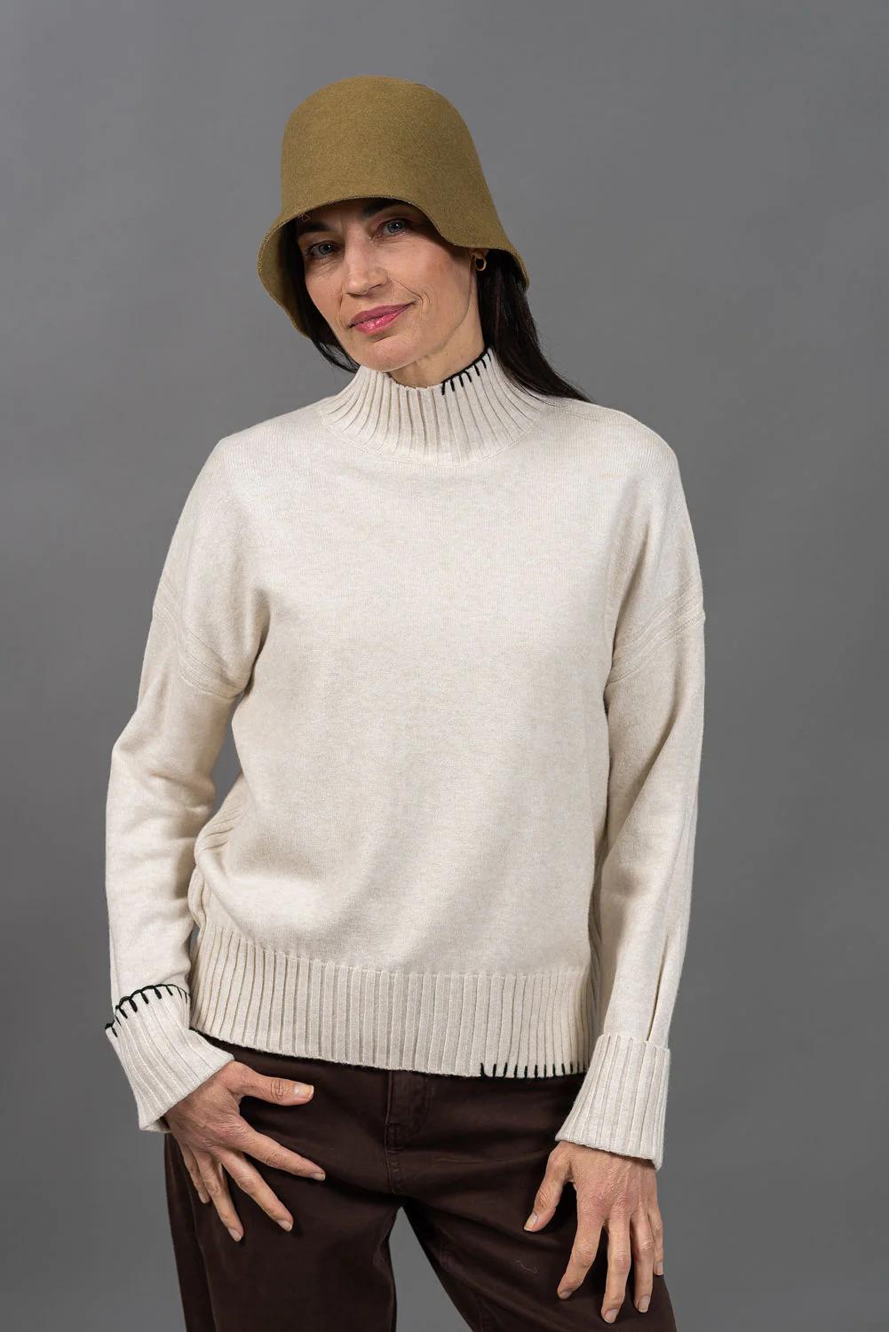 סריג תך עשוי בקו מינימליסטי, עם רקמה בצבע שחור, בעבודת יד - כזו שמוסיפה עניין ודיוק עיצובי.