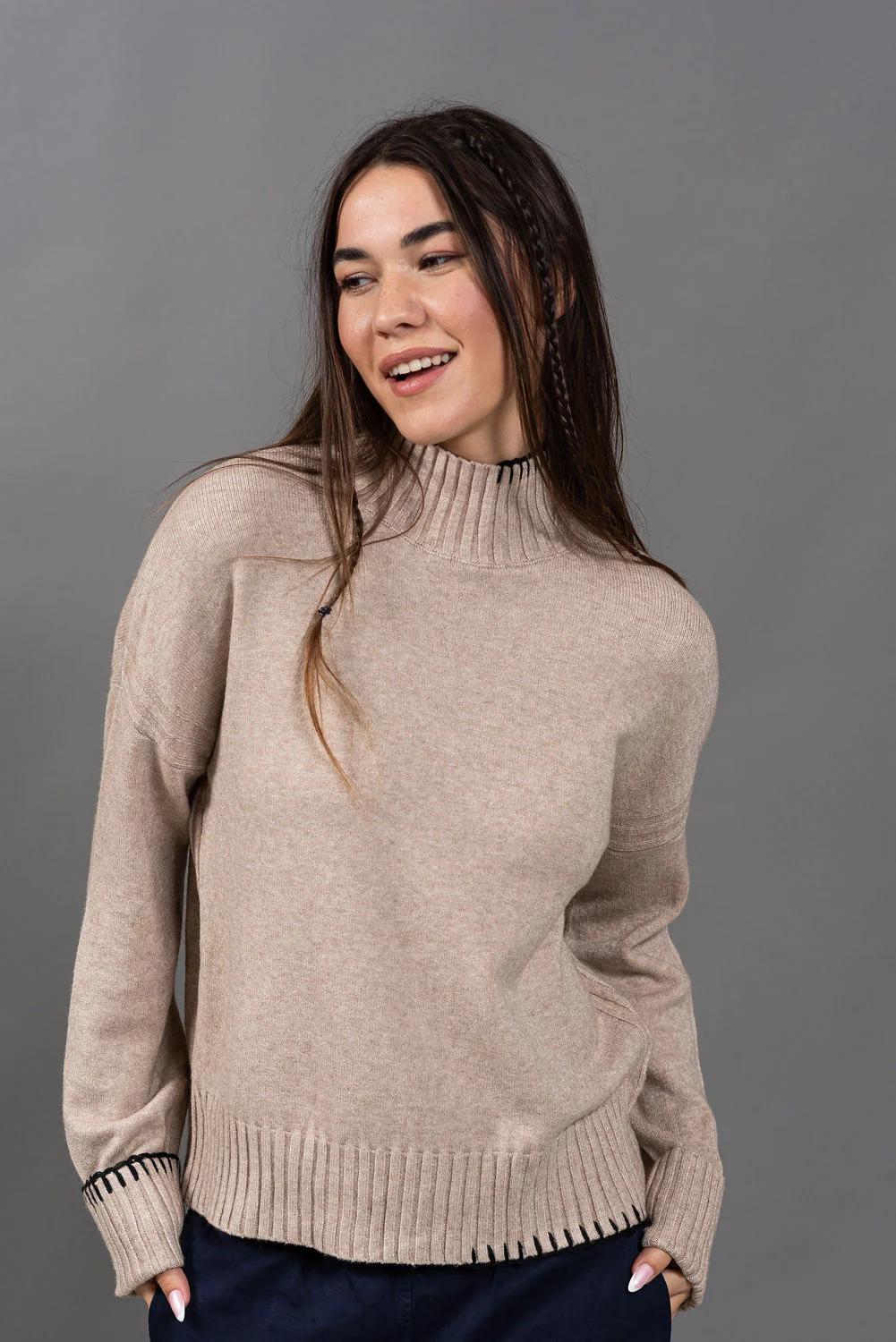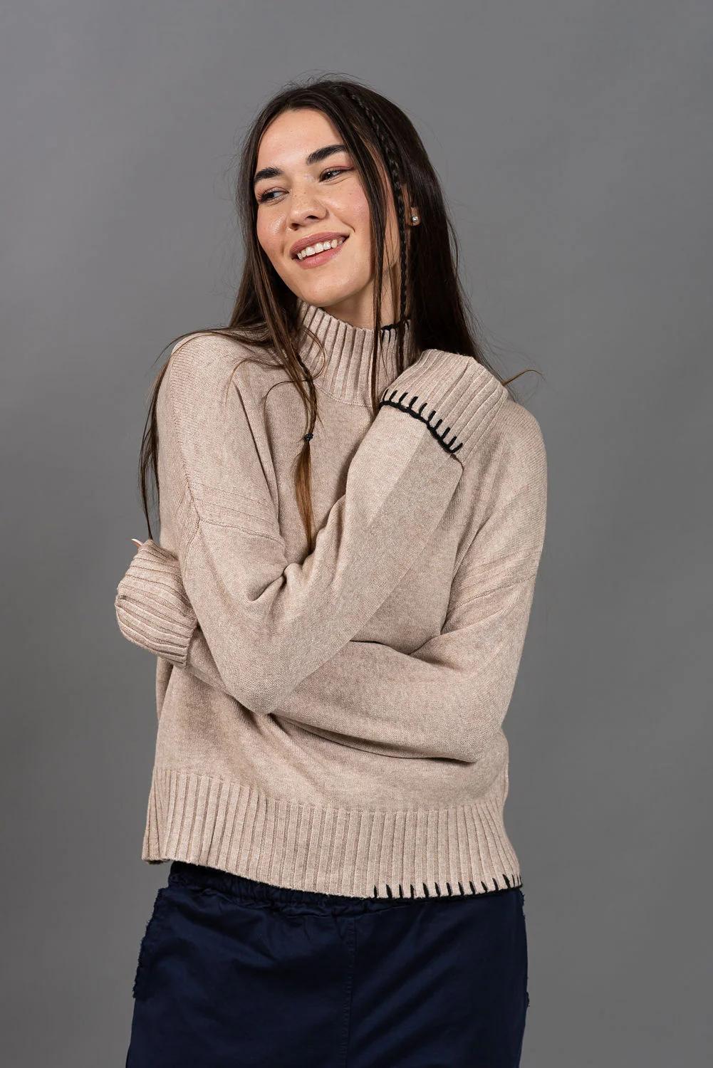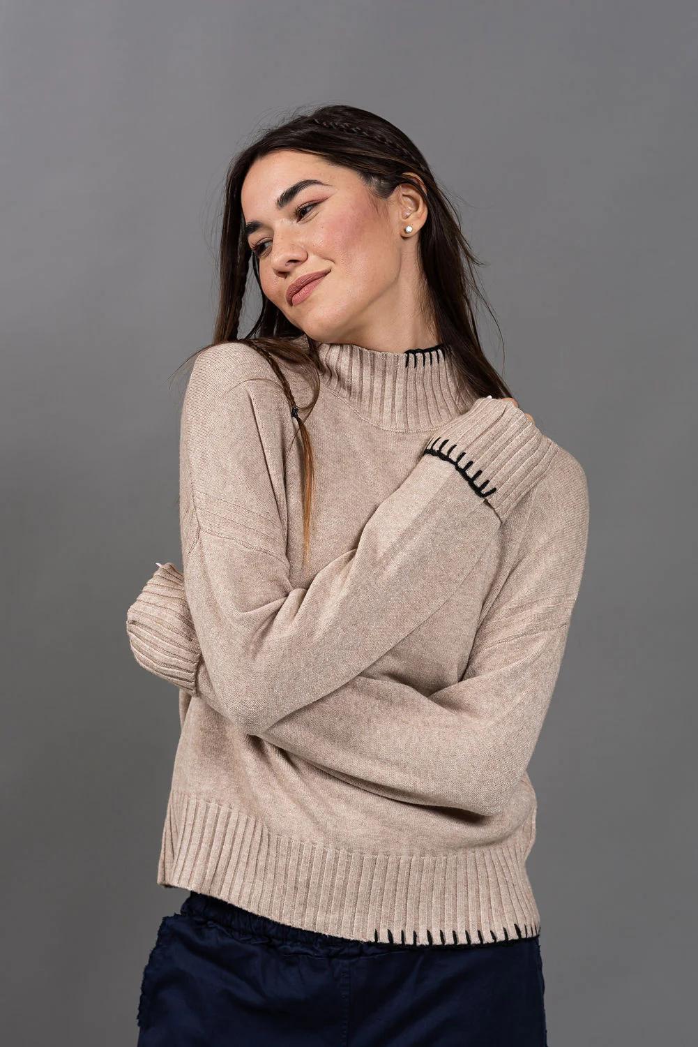 סריג תך עשוי בקו מינימליסטי, עם רקמה בצבע שחור, בעבודת יד - כזו שמוסיפה עניין ודיוק עיצובי.