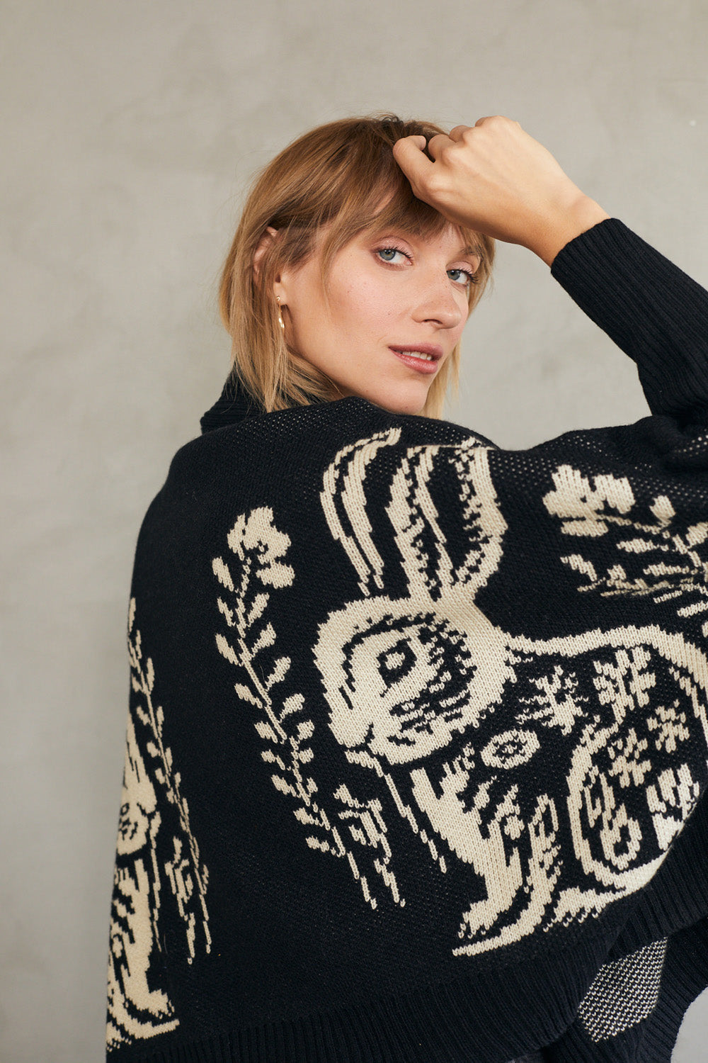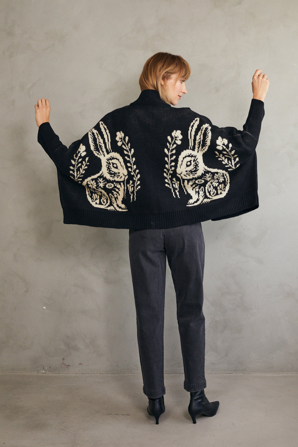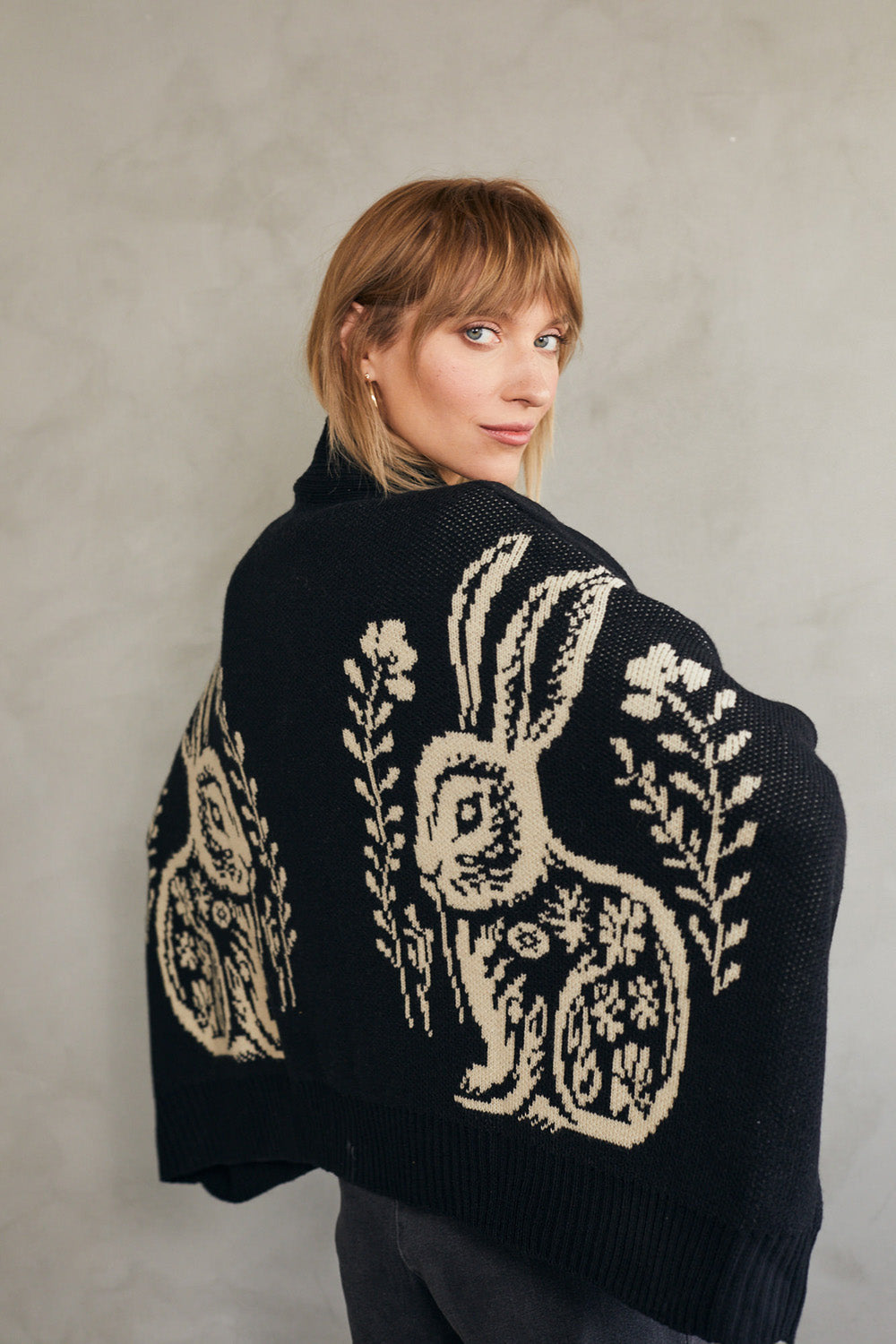 קרדיגן סוודר בגזרת אוברסייז עם דוגמת ארנב (באני) היסטרית.