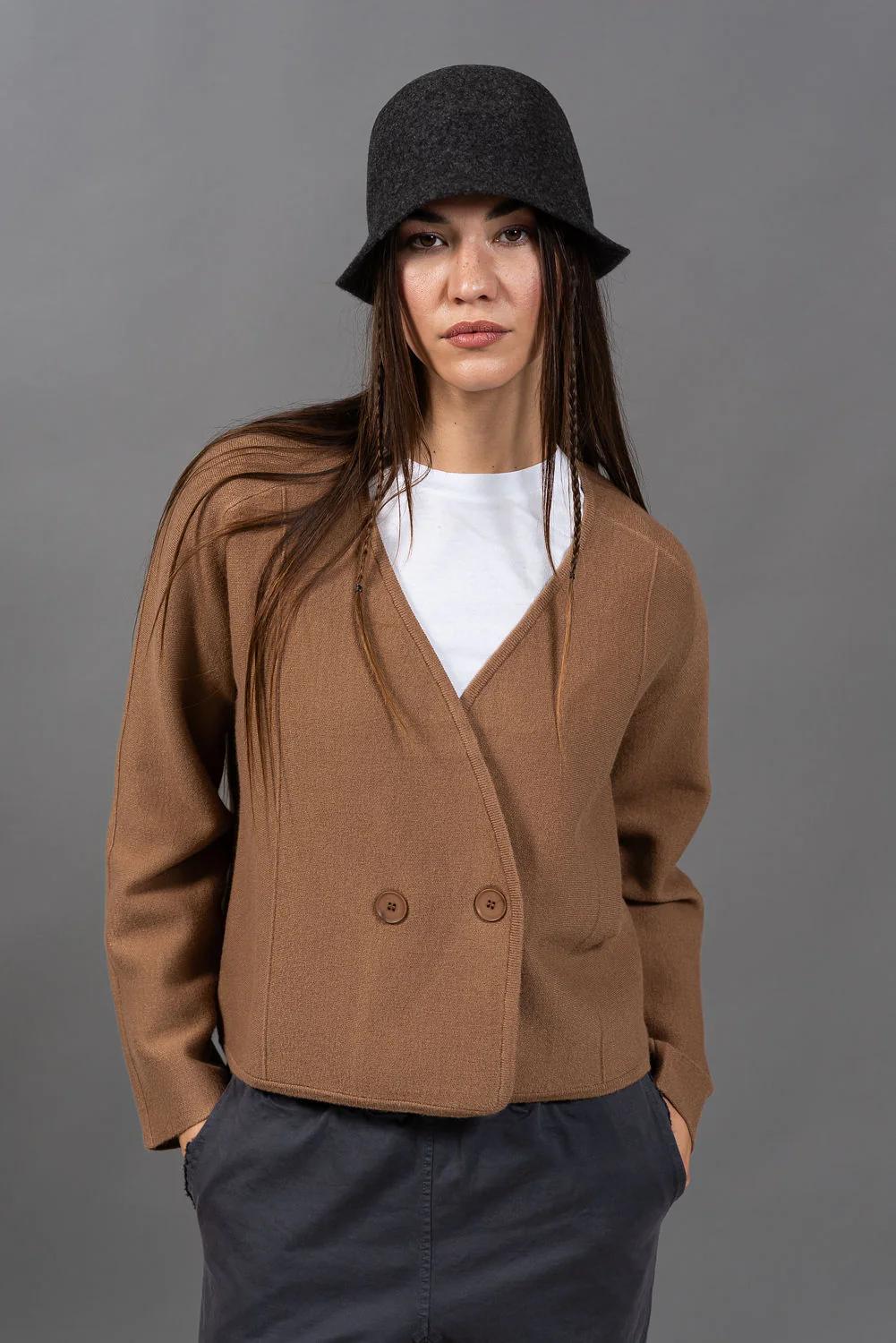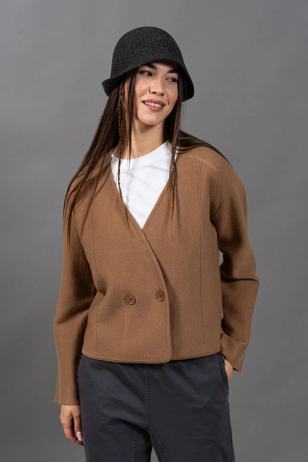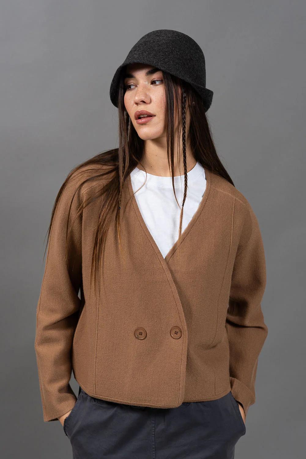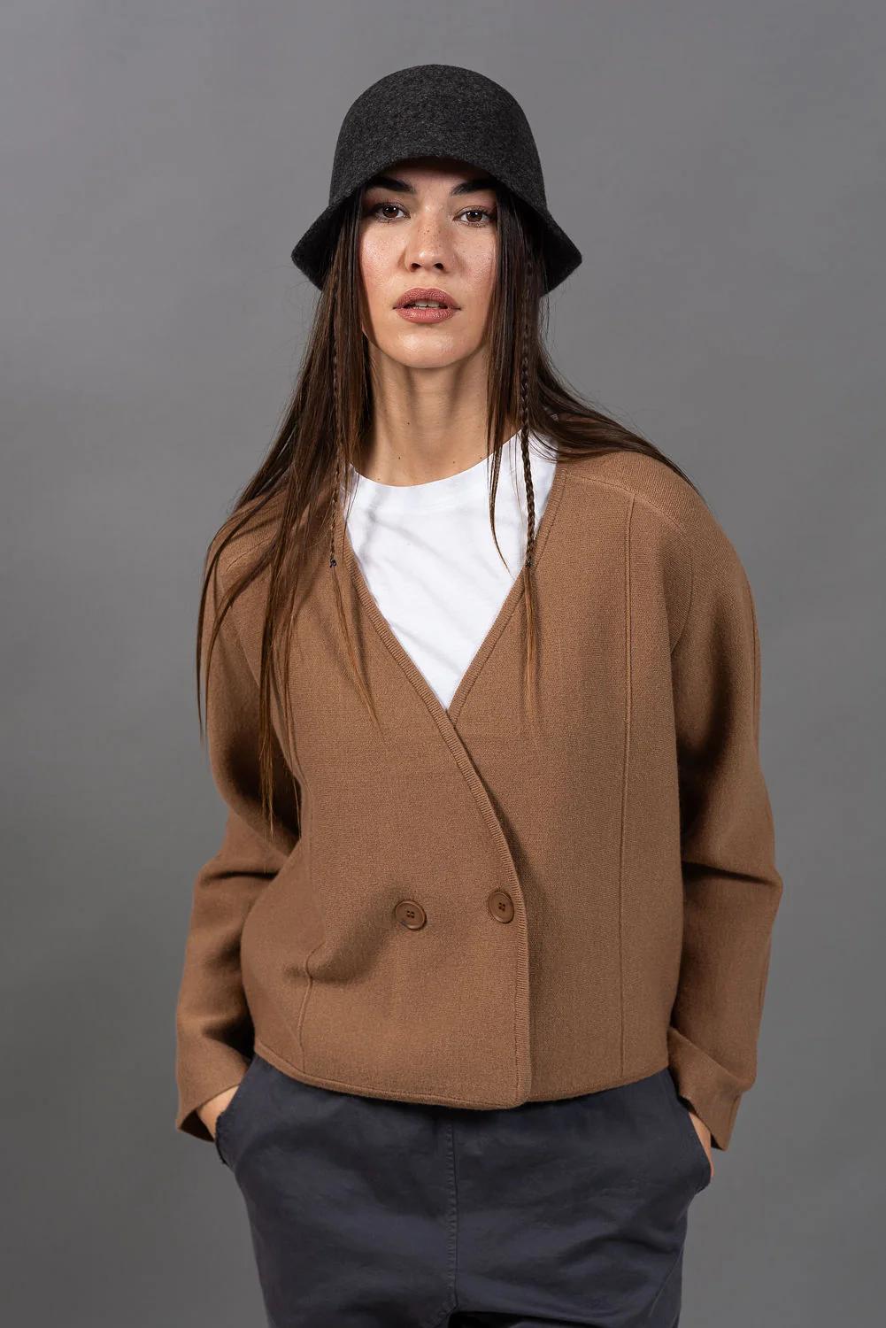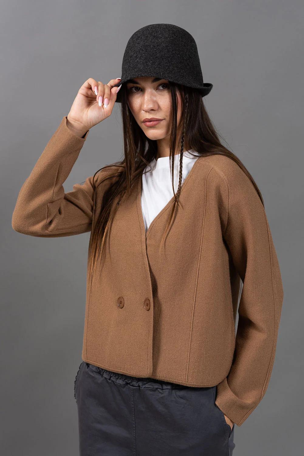 סריג עשוי בסריגה צפופה קרדיגן משובח שיושב על התפר בין סריג לג'קט  - בד צפוף ויציב ששומר על הצורה , עם סגירה אלכסונית כפולת כפתורים וחתכים מדויקים.