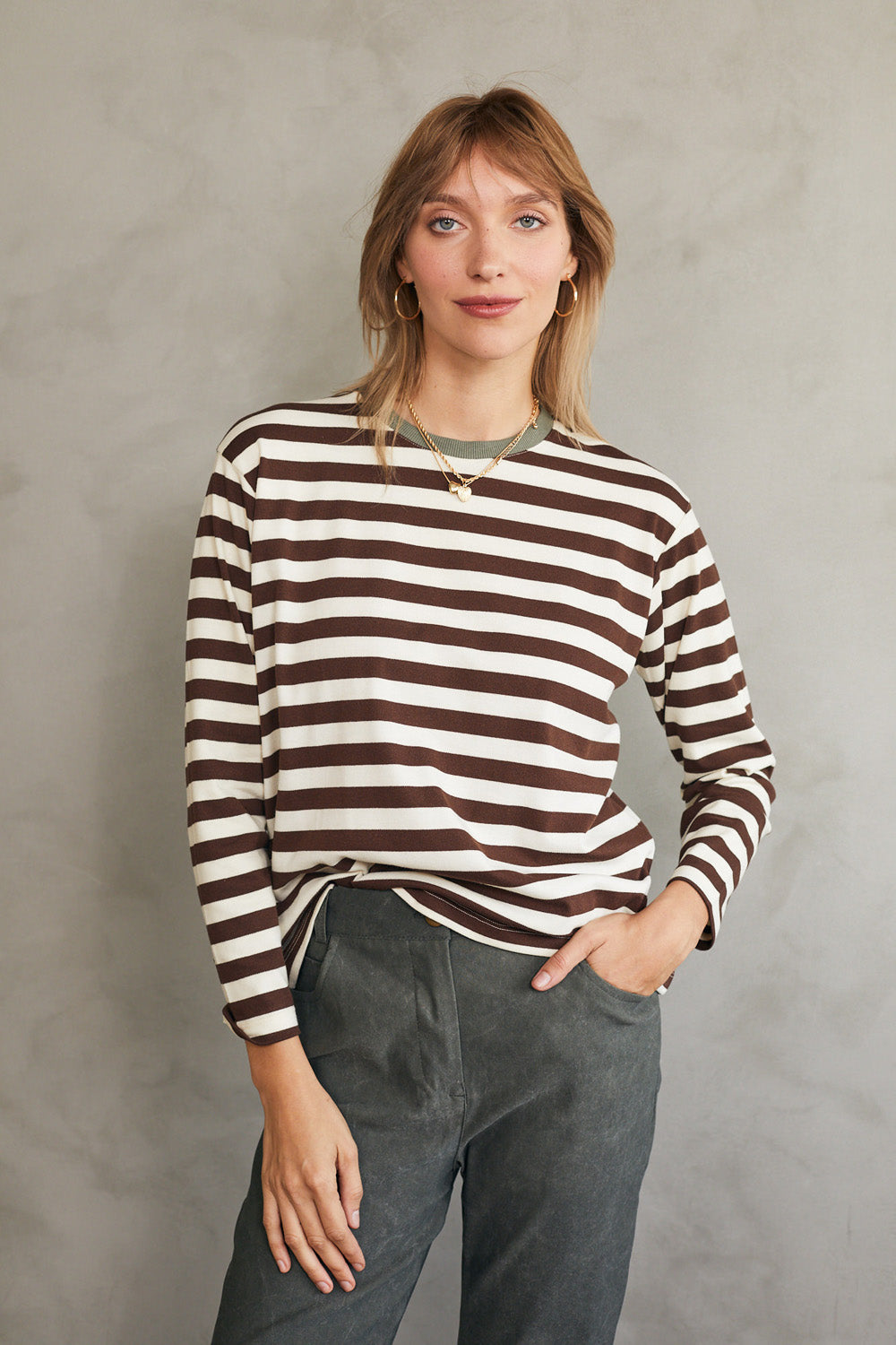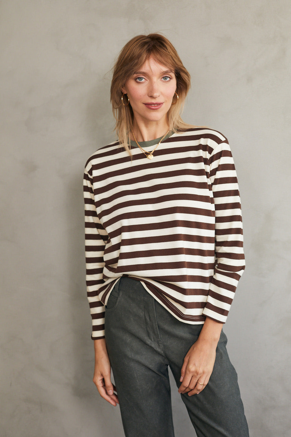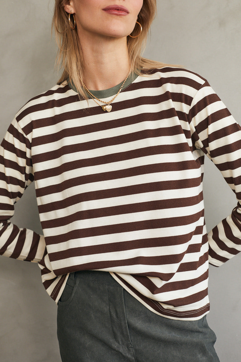 חולצת טי מושלמת ארוכה - פסים חום זית