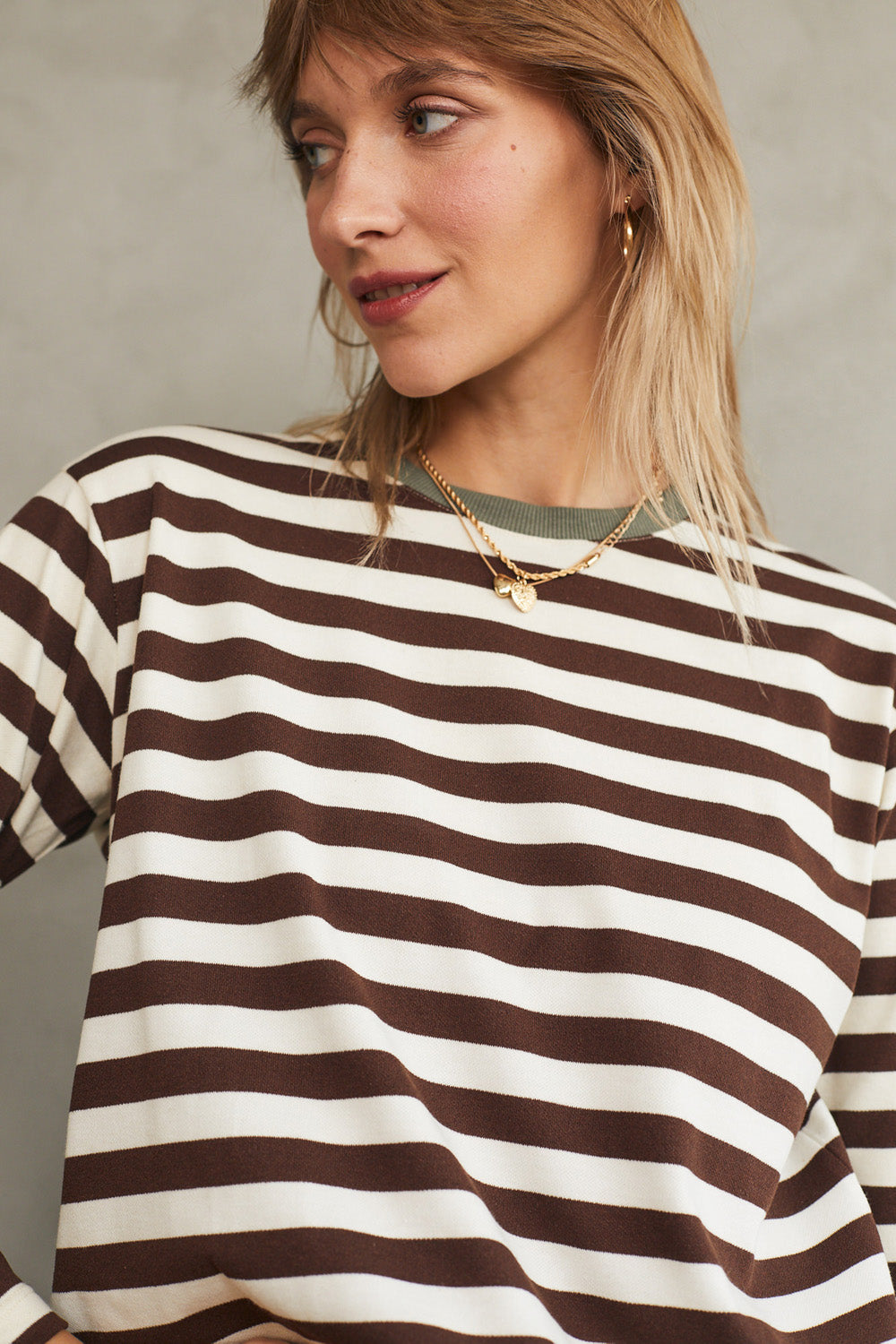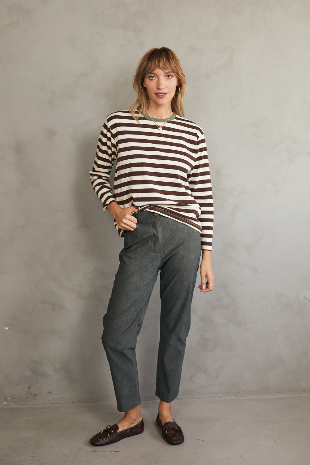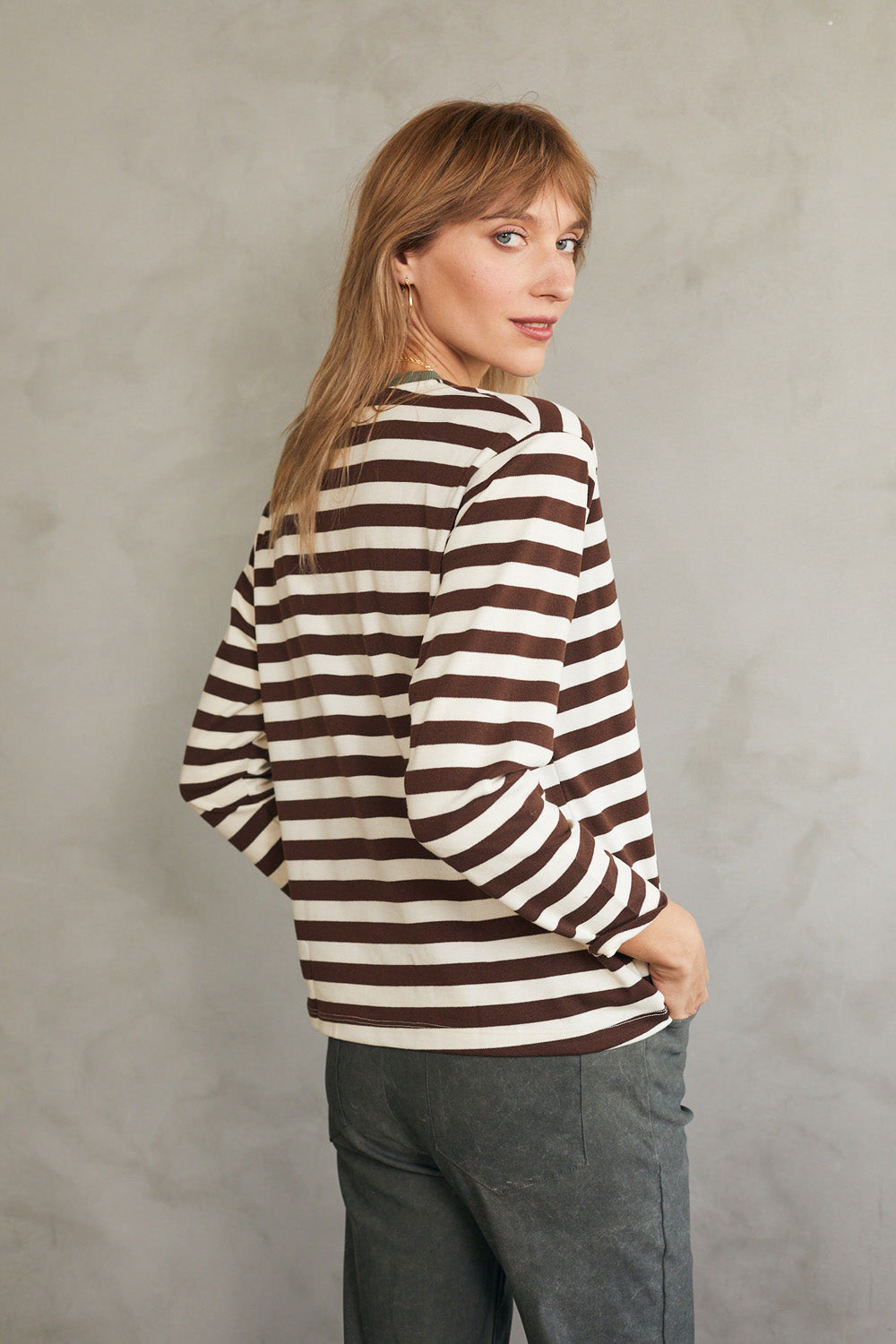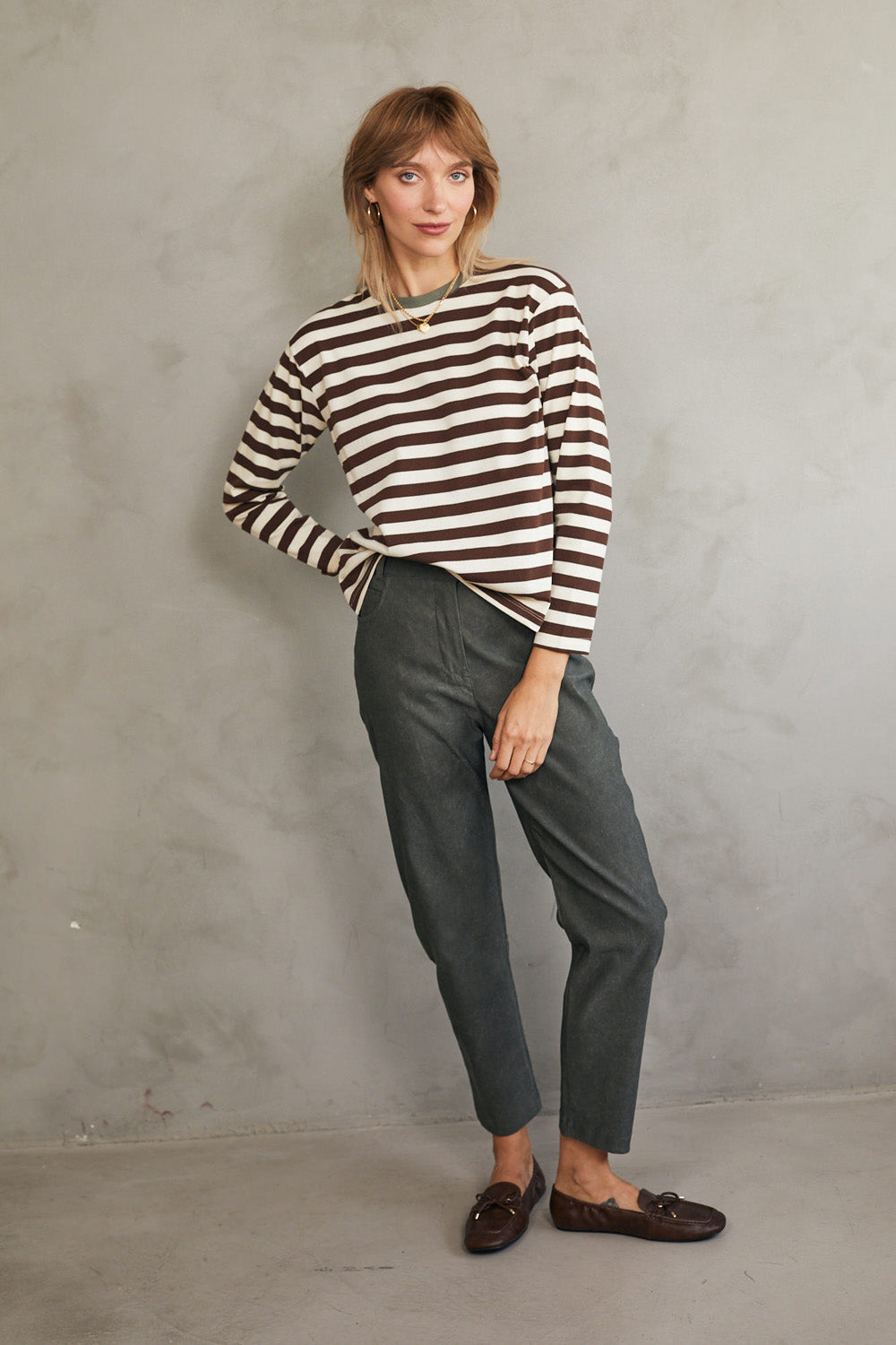 חולצת טי מושלמת ארוכה - פסים חום זית