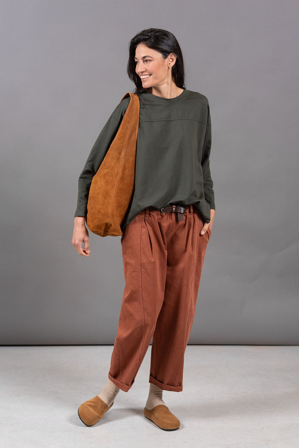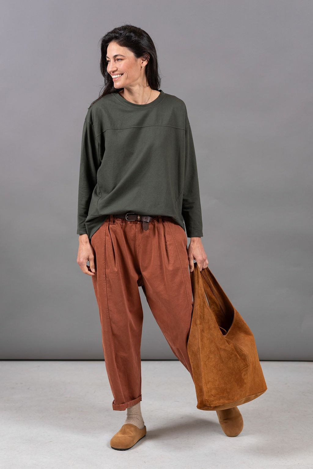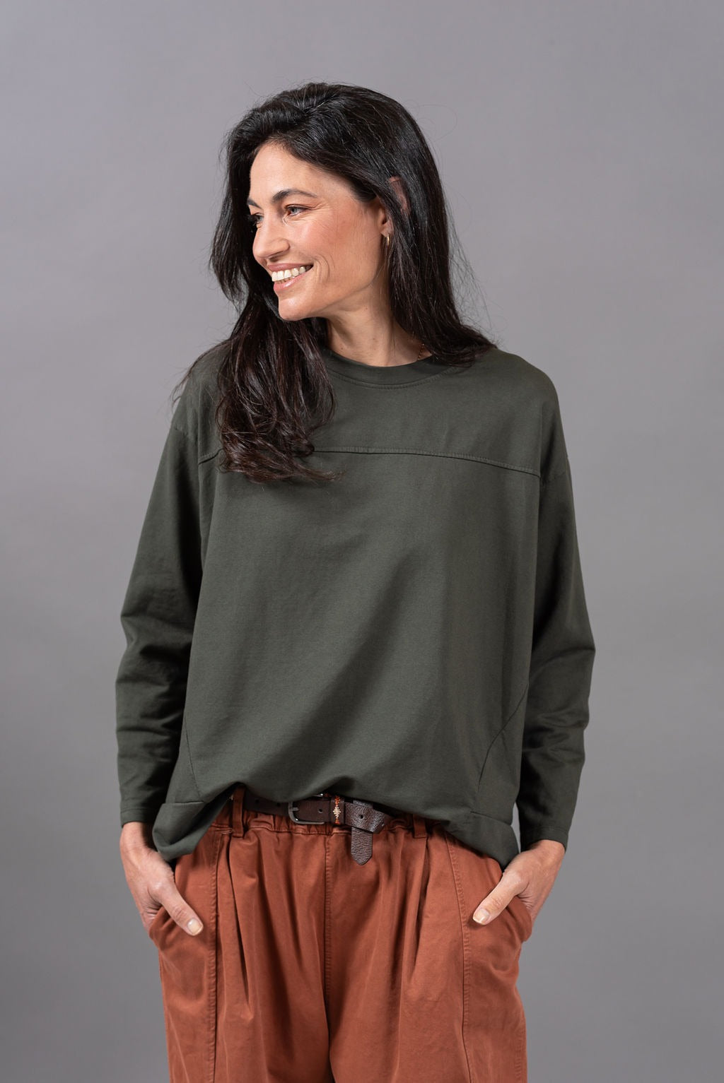 גזרה משוחררת וכפית, צווארון עגול שמוסיף טאץ עדין ומדויק.
