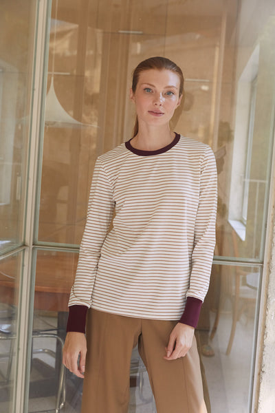 חולצת טי מושלמת V - פס נייבי, רקע בז'