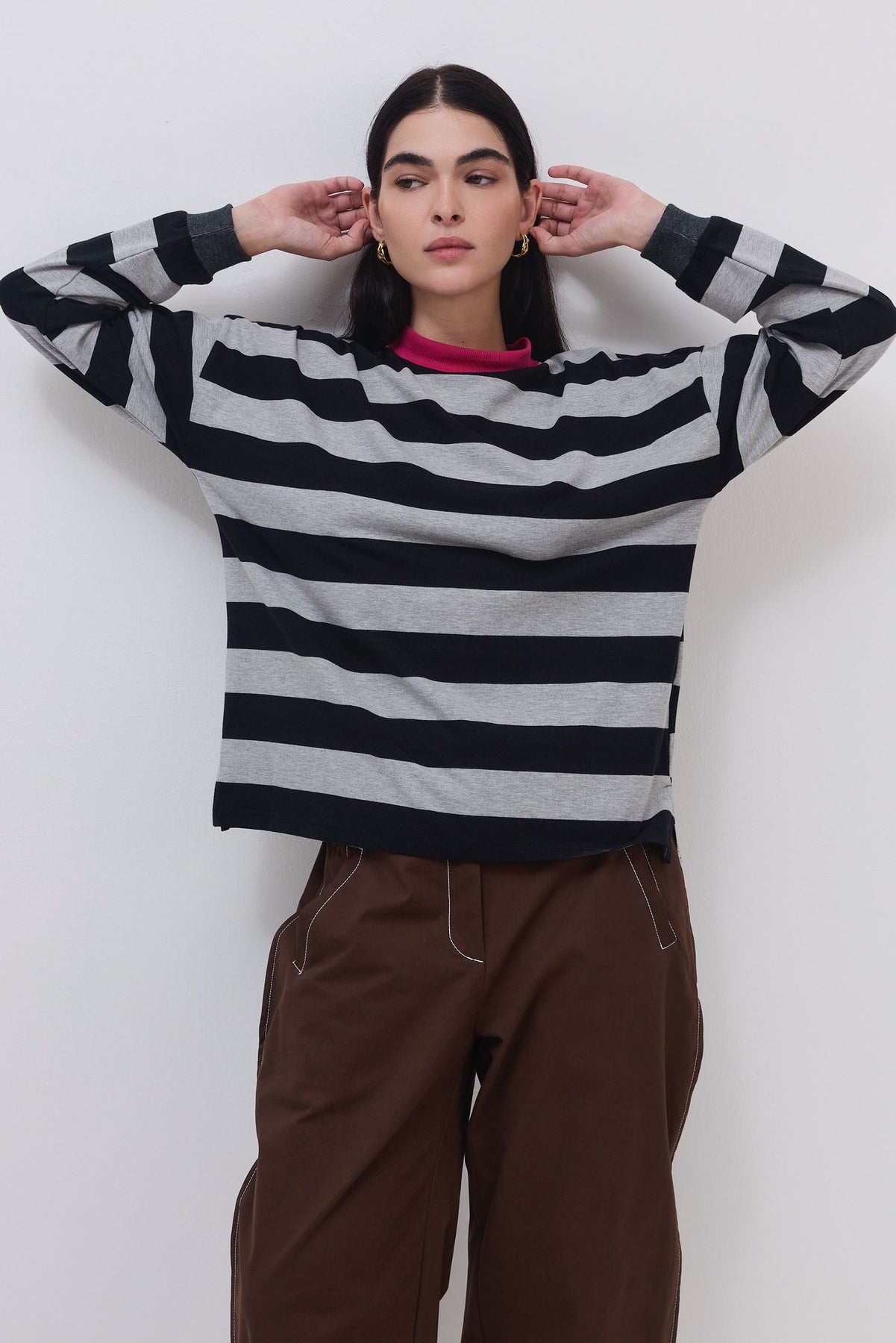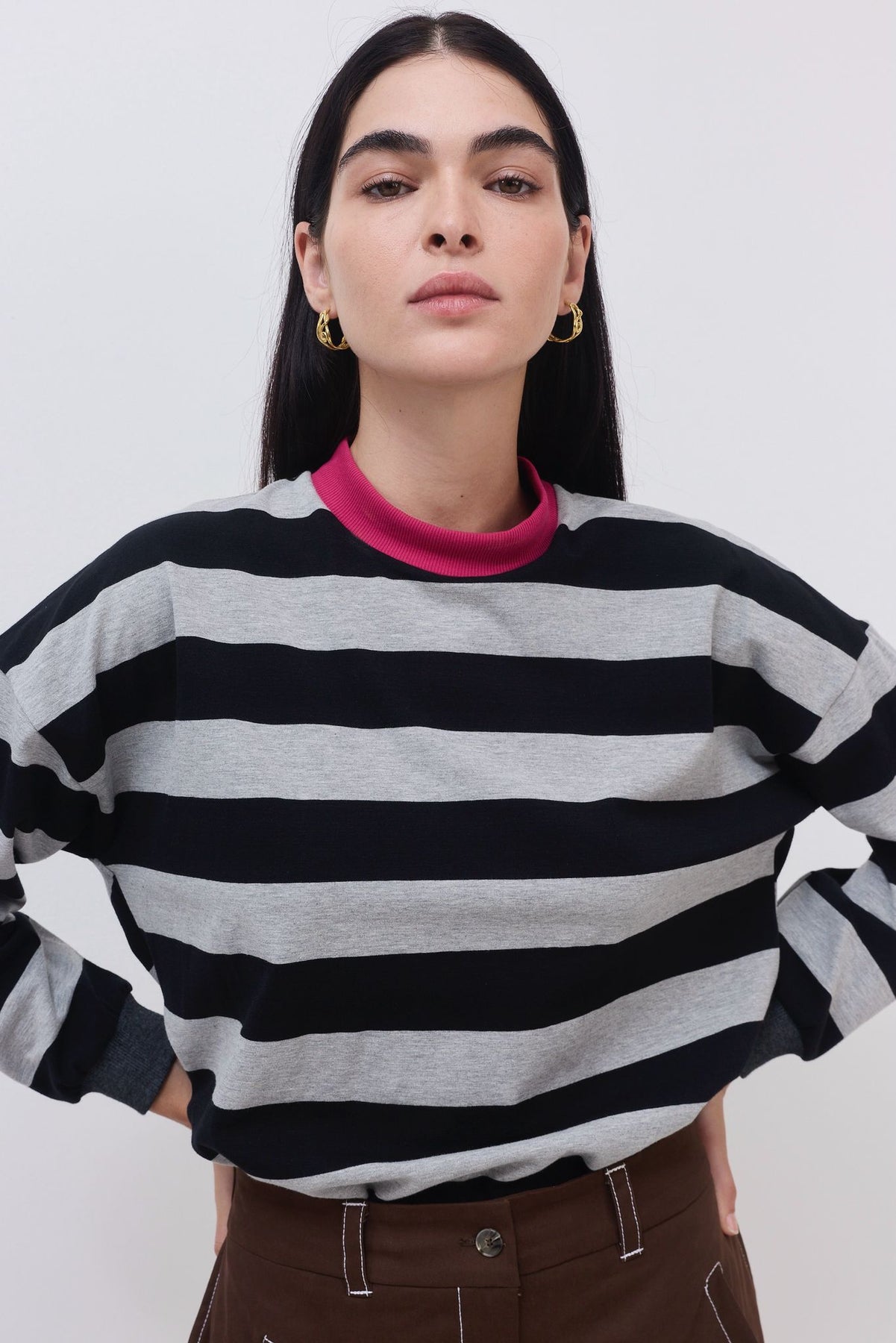 בד פסים אפור שחור בשילוב צווארון ורוד.