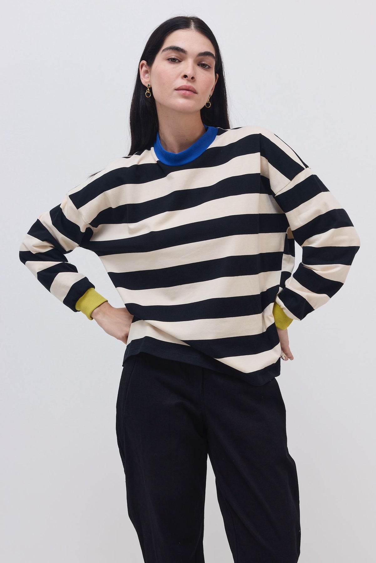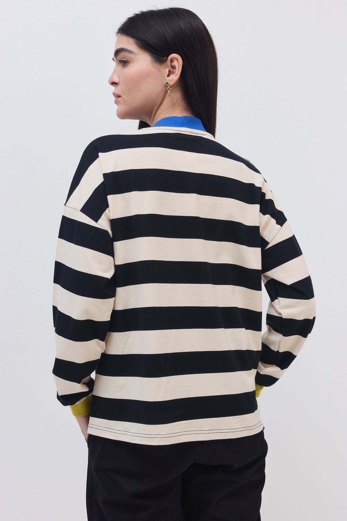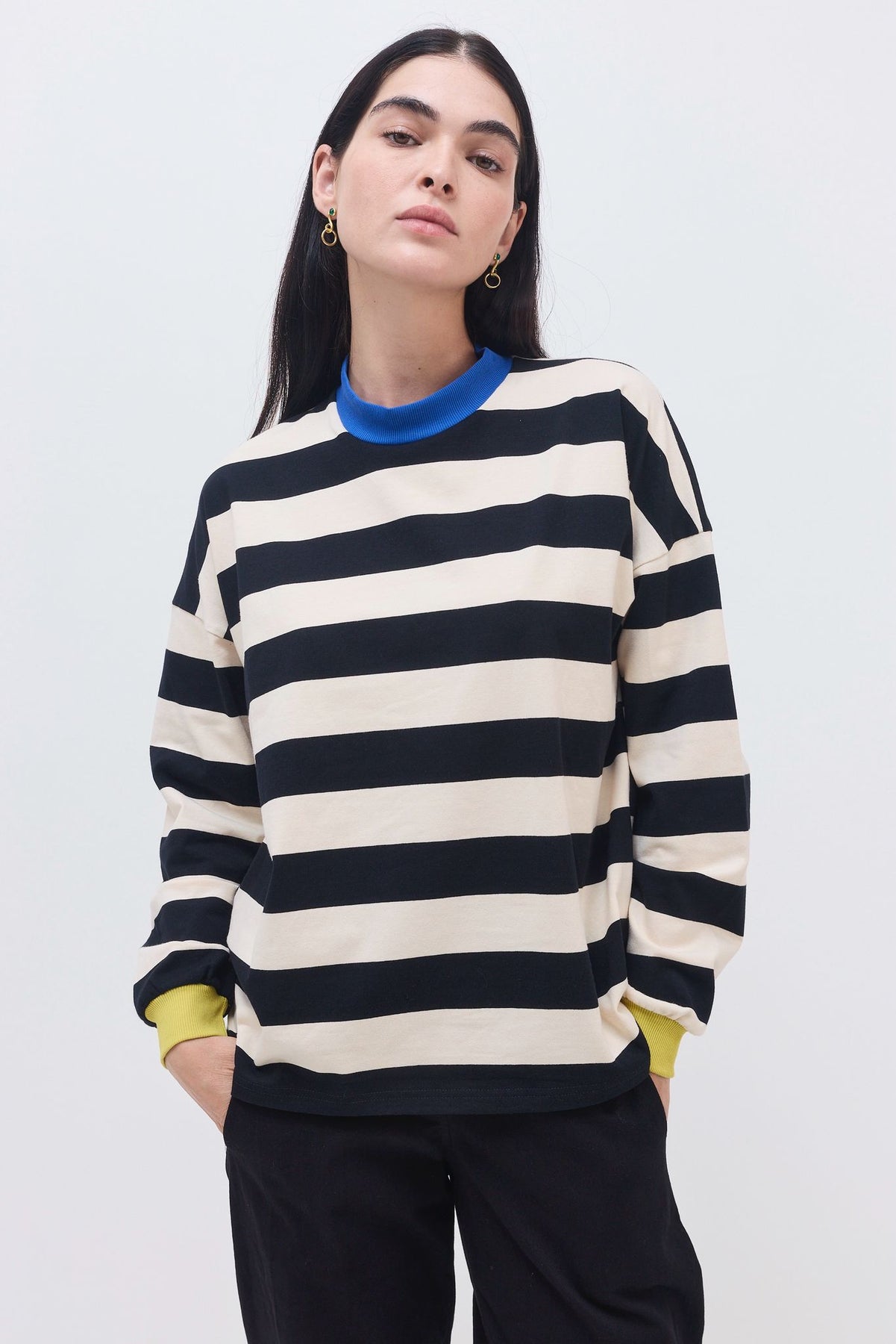 בד פסים שחור שמנת בשילוב צווארון כחול.
