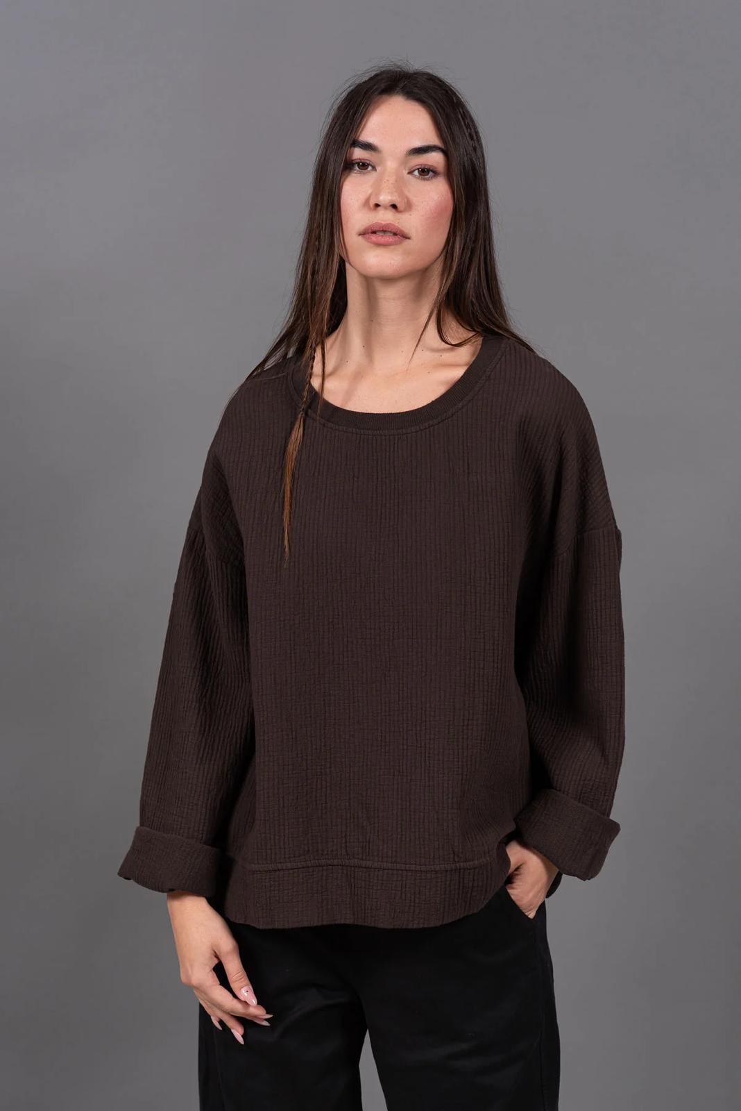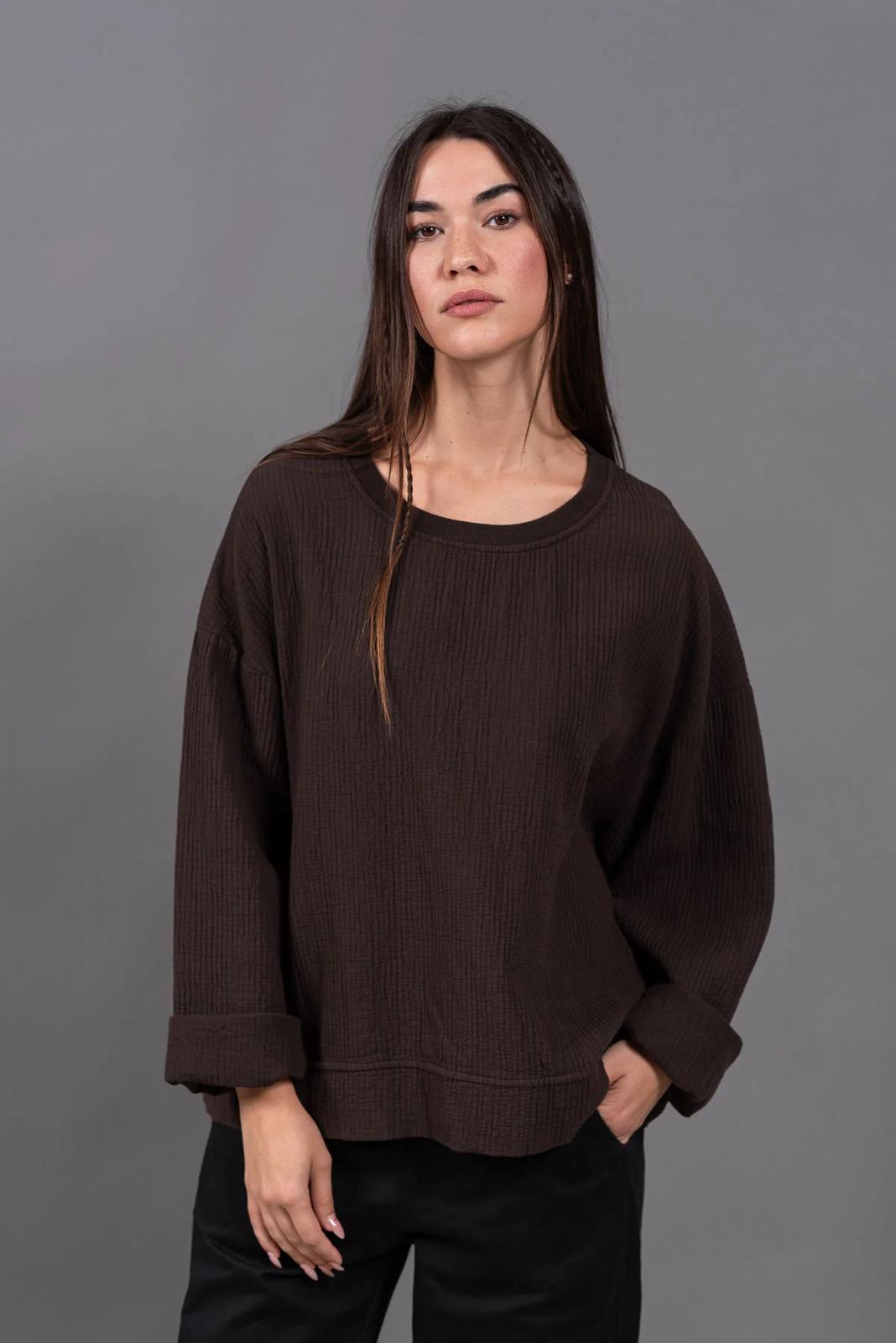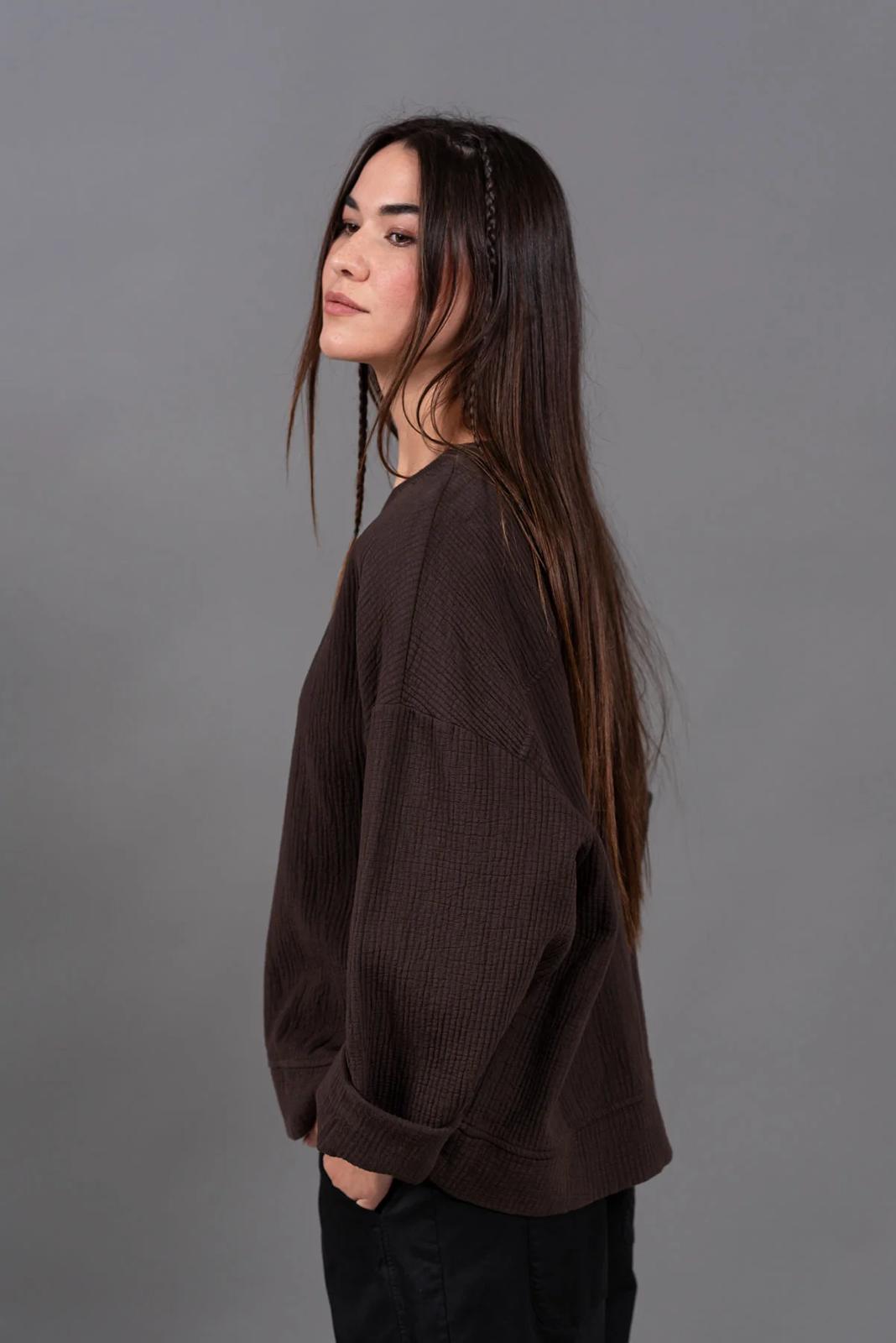 סווטשירט כותנה רך בטקסטורה חיה ויחודית, בגזרה רחבה ומשוחררת מהגוף.