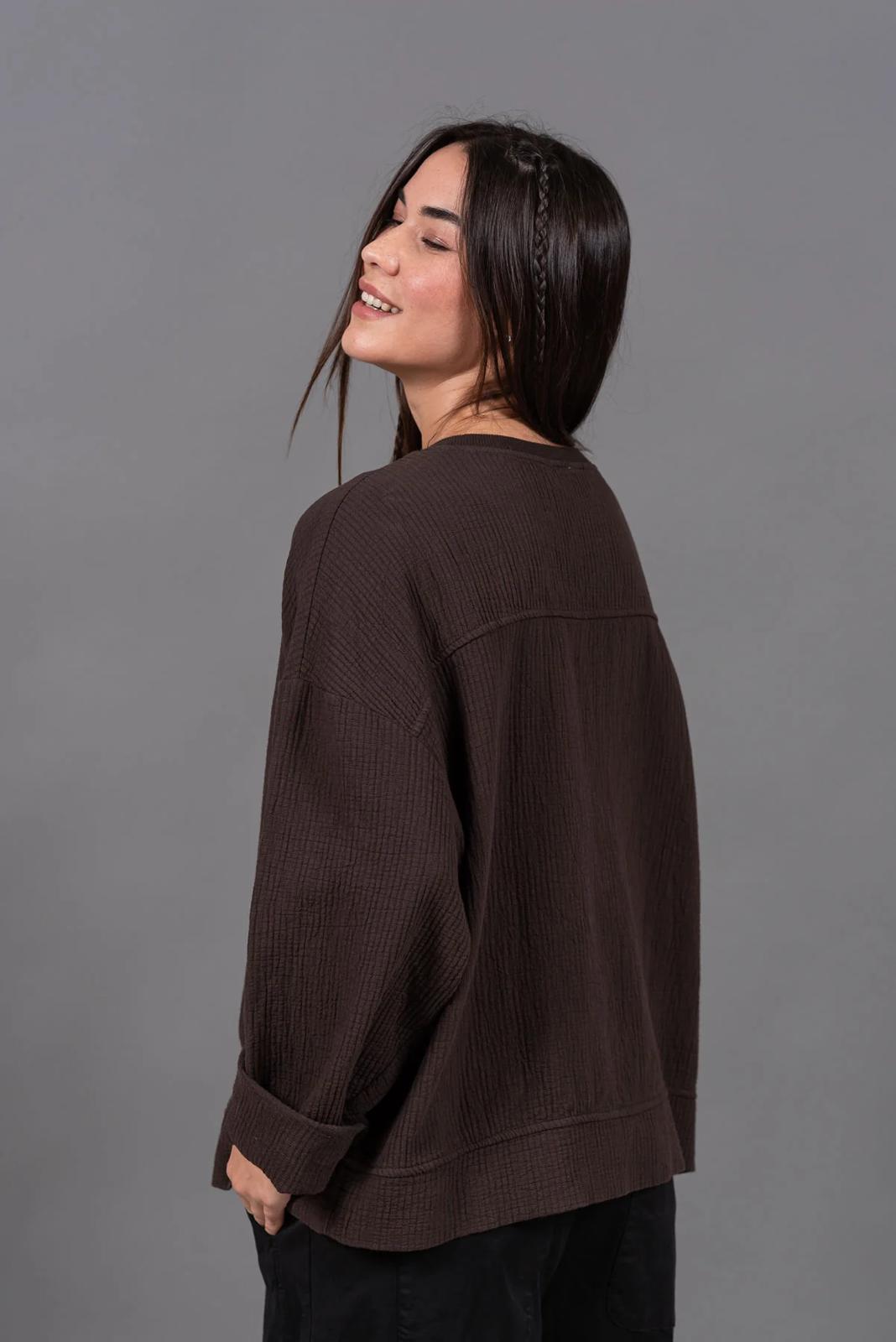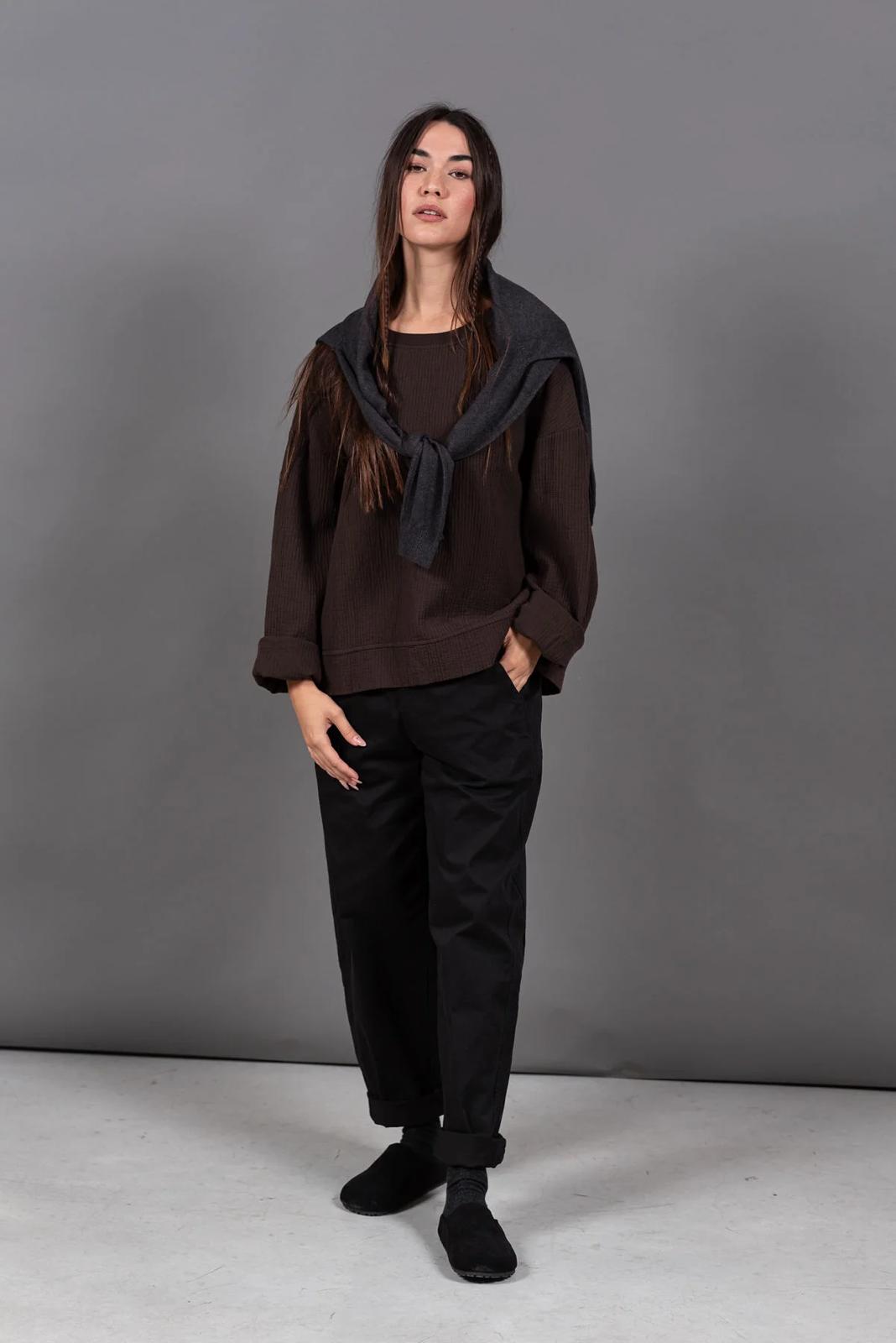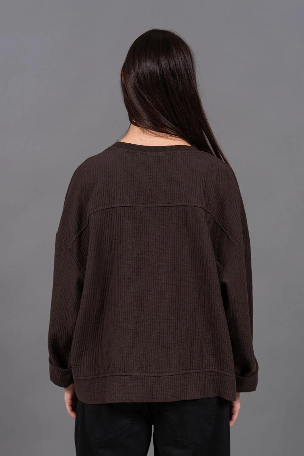 סווטשירט כותנה רך בטקסטורה חיה ויחודית, בגזרה רחבה ומשוחררת מהגוף.