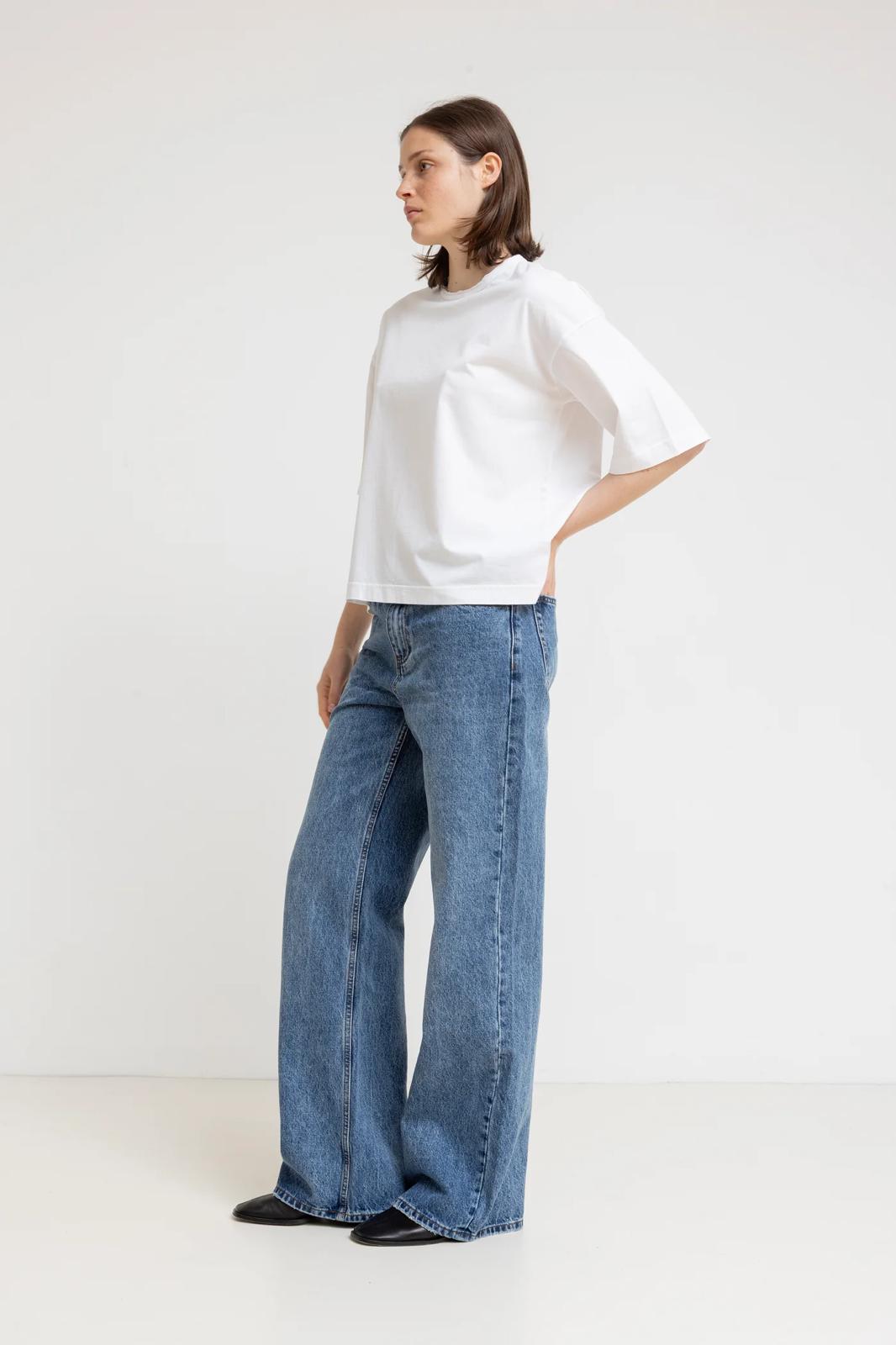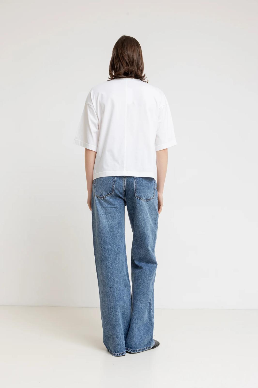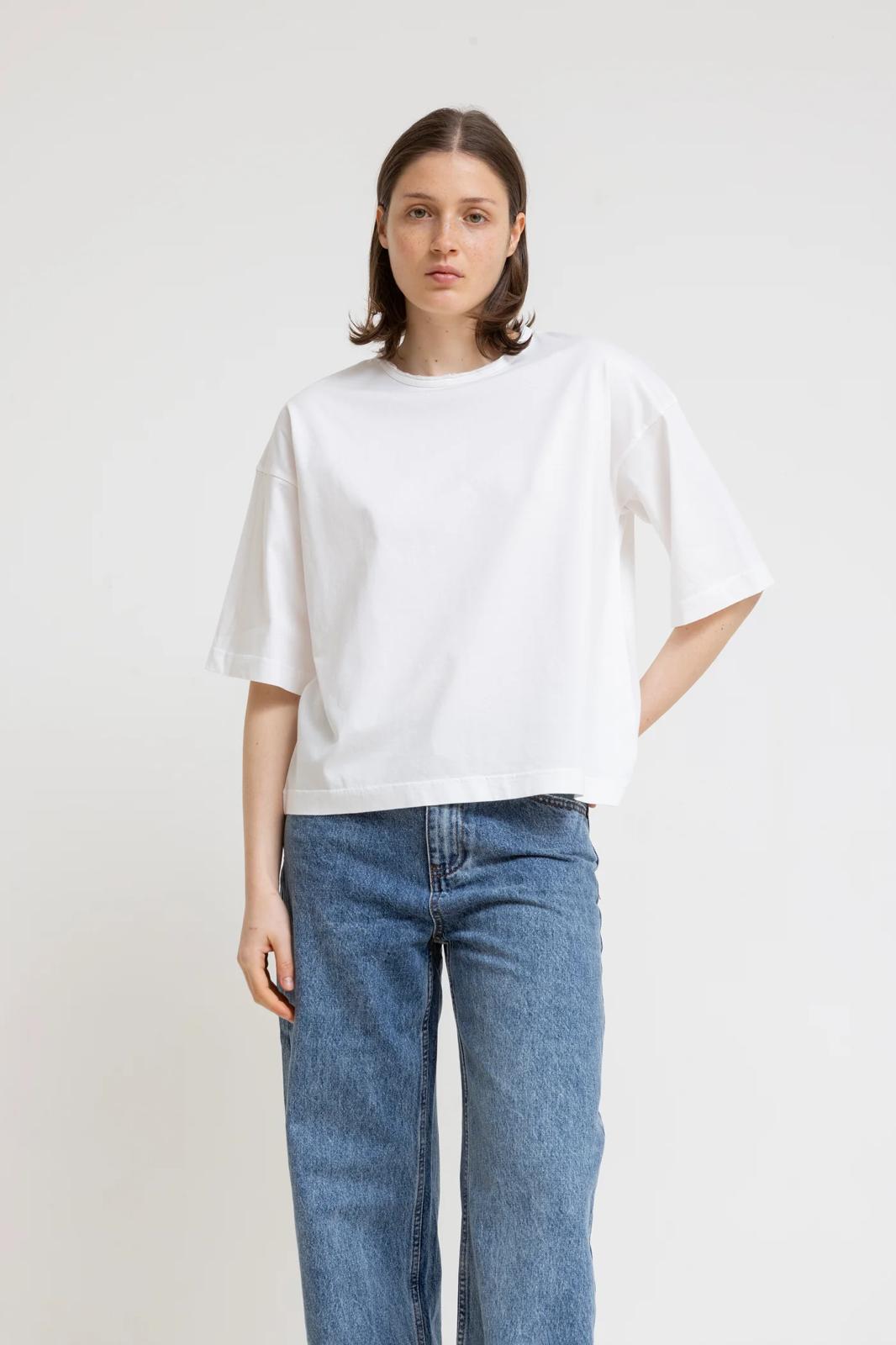 חולצת בייסיק מבד כותנה איכותית בגזרה רחבה ונינוחה, באורך מותן.